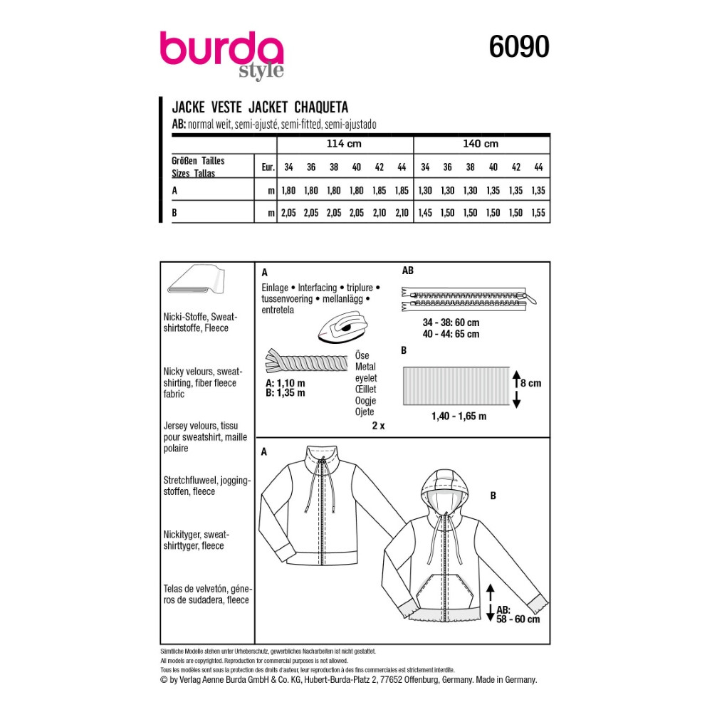 Střih ve velikostech EUR 34-44, úroveň obtížnosti šití: 2 lehká info, doporučené látky: plyš nicki, teplákovina, fleece