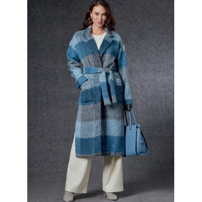 Střih Vogue na rovný kabát a vestu s páskem a velkými kapsami a kalhoty s gumou v pase