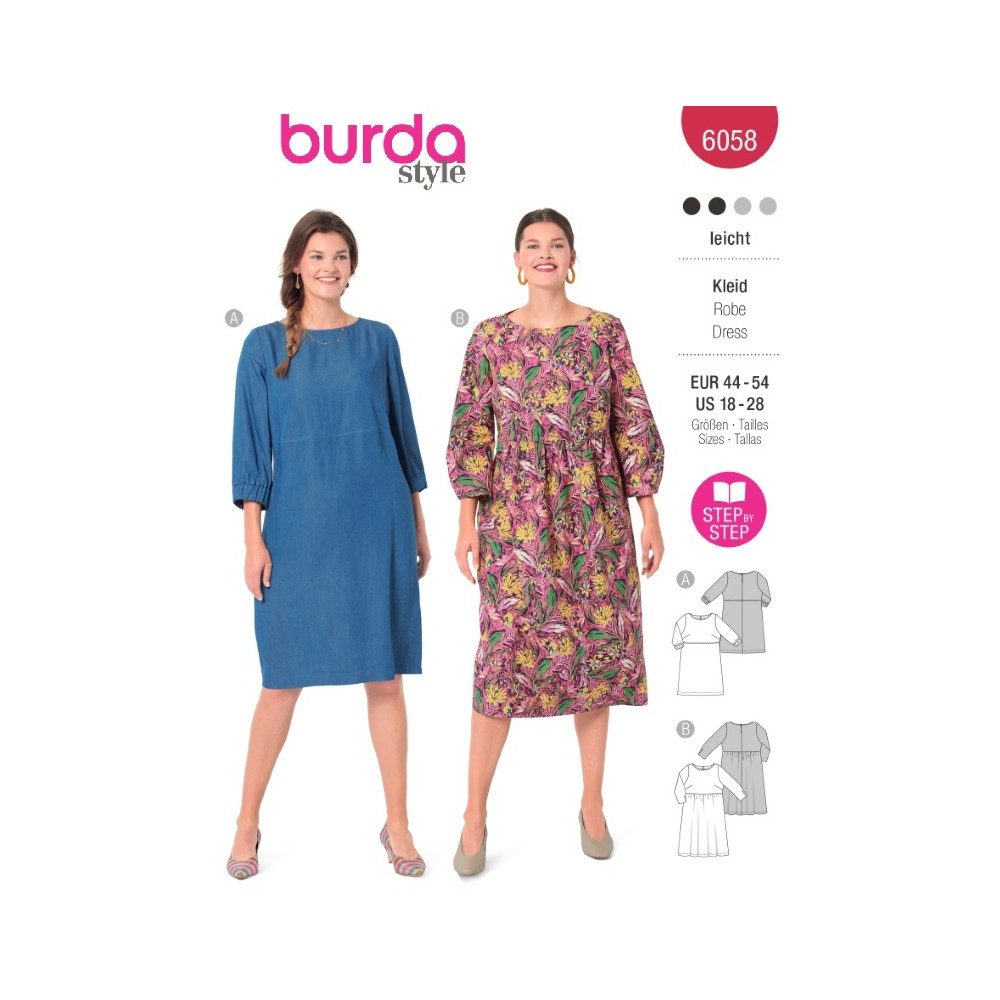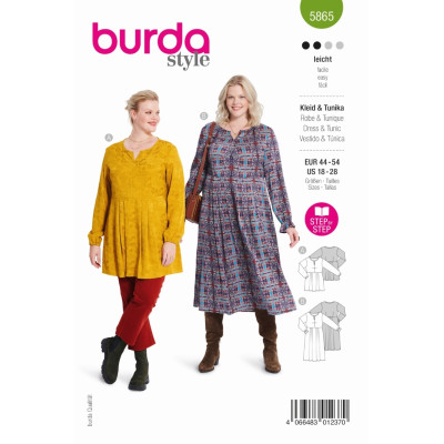 Střih Burda na šaty a tuniku s dlouhým rukávem a rozšířenou sukní se sklady