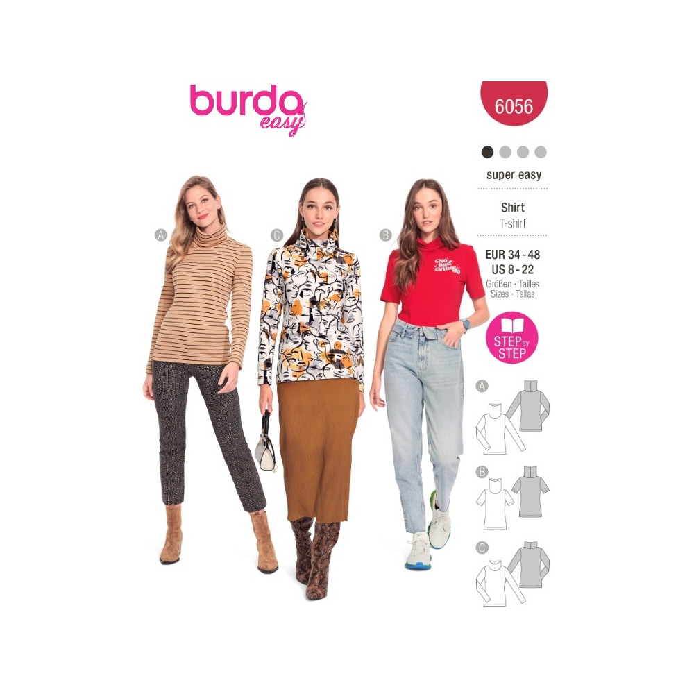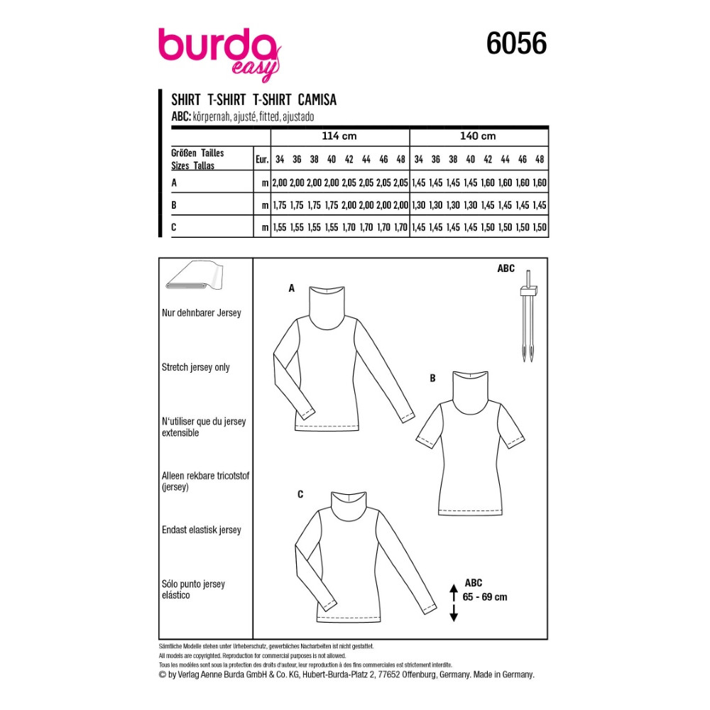 Střih ve velikostech EUR 34-48, úroveň obtížnosti šití: 1 velmi lehká info, doporučené látky: pouze strečový žerzej