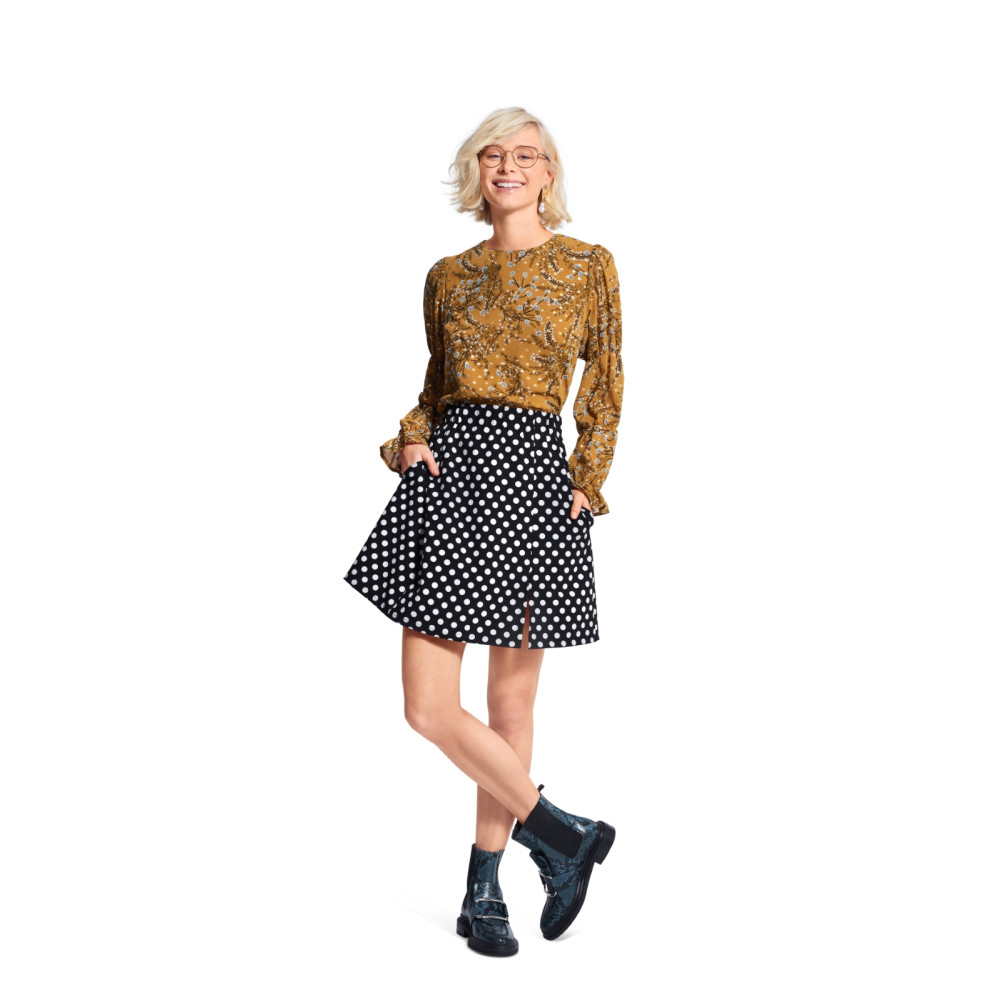 Střih Burda na kolovou sukni se sklady a kapsami v bočních švech a vázáním v pase.