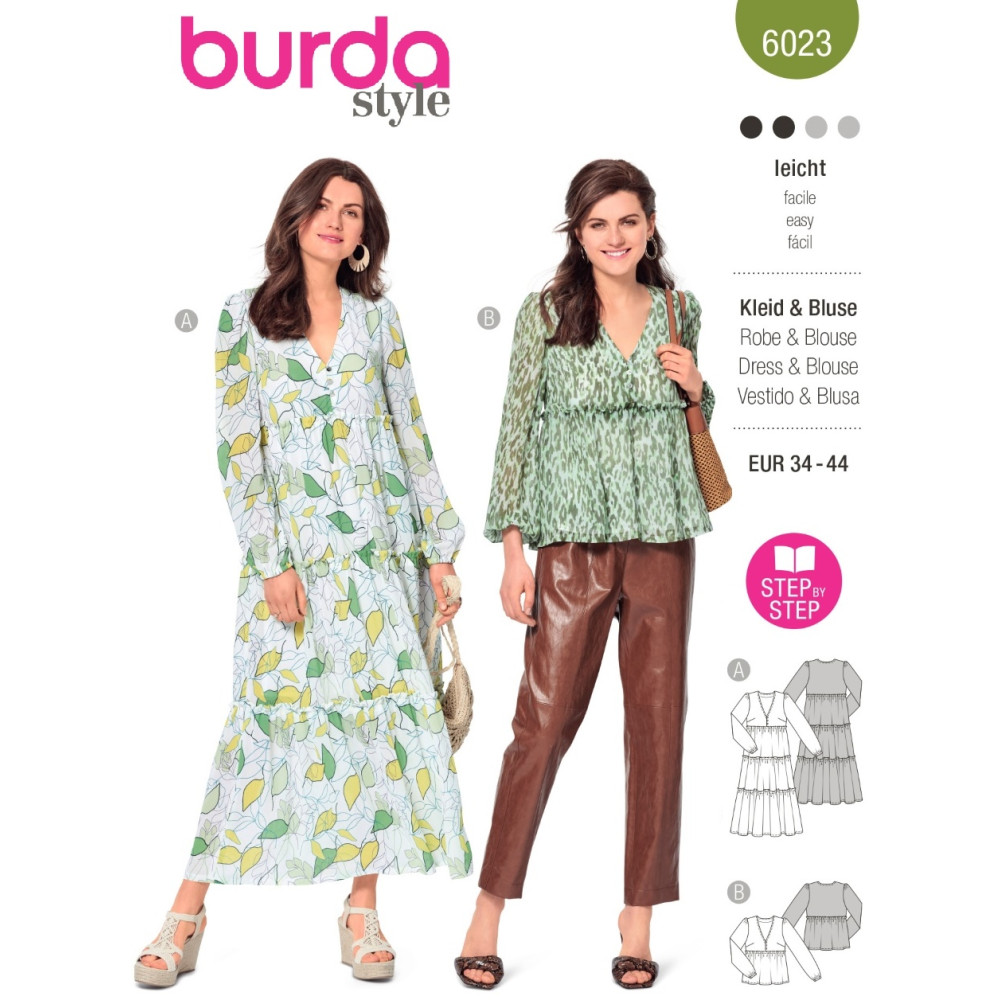Střih Burda na pohodlné volnější šaty s delším rukávem nebo delším zvonovým rukávem.