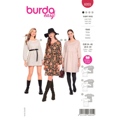Jednoduchý střih Burda na šaty s vysokým pasem, nabíranou sukní a dlouhými rukávy