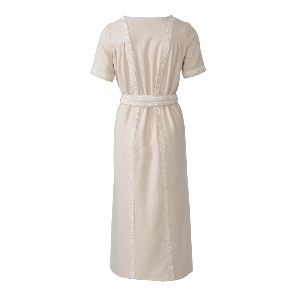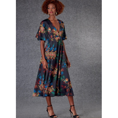 Střih Vogue na široké empírové šaty s hlubokým V-výstřihem, sklady a kapsami v bočních švech