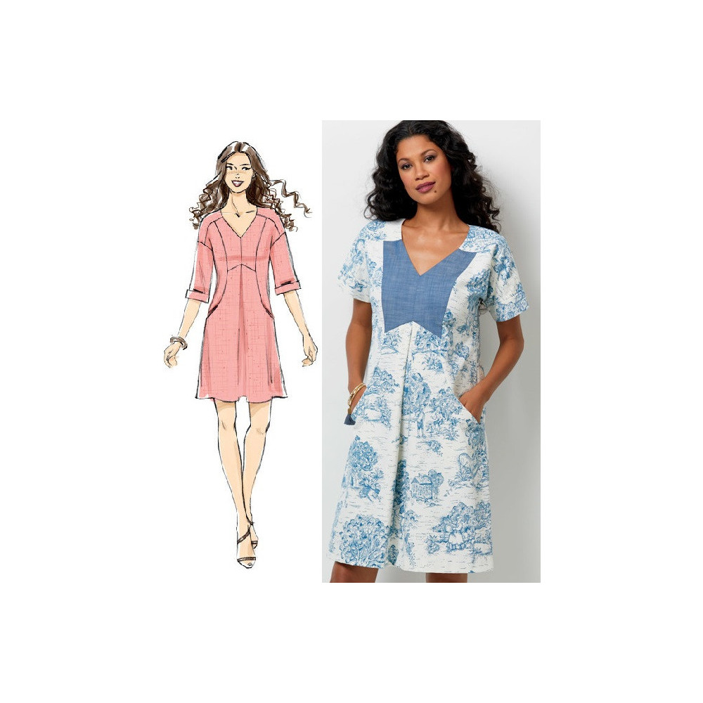 Střih Butterick na šaty s V-výstřihem, kontrastní vsadkou, převráceným skladem a kapsami