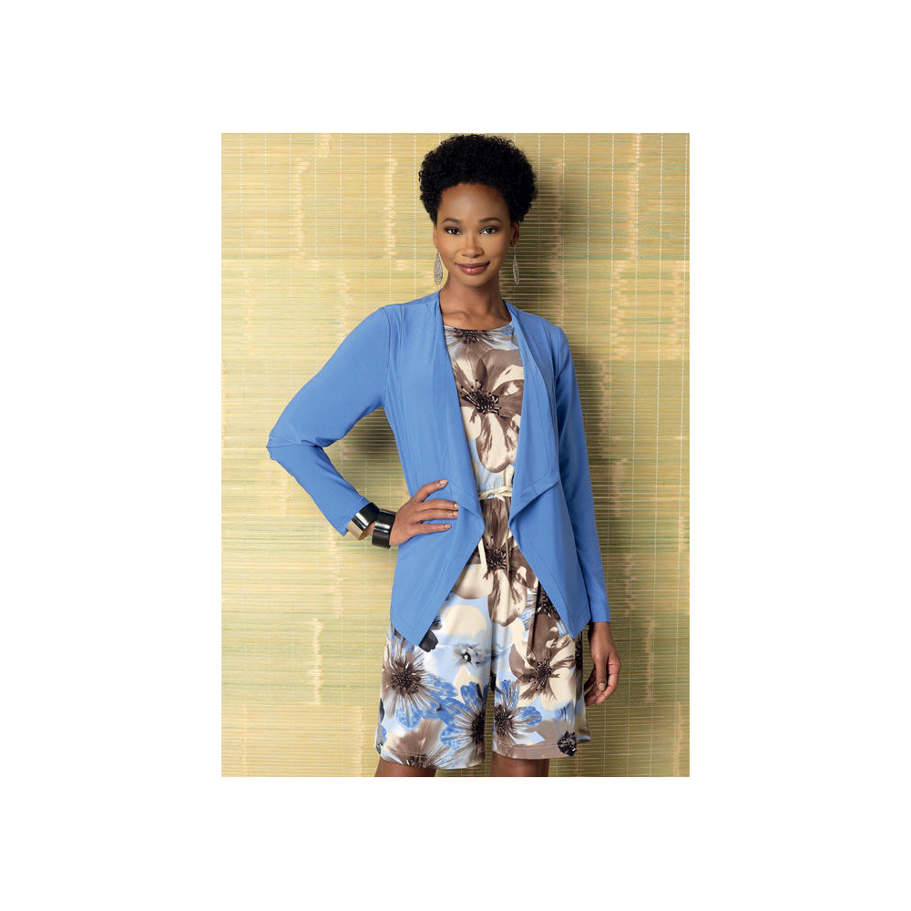 Střih Burda na jednoduché úpletové šaty a jednoduchý kabátek bez zapínání.