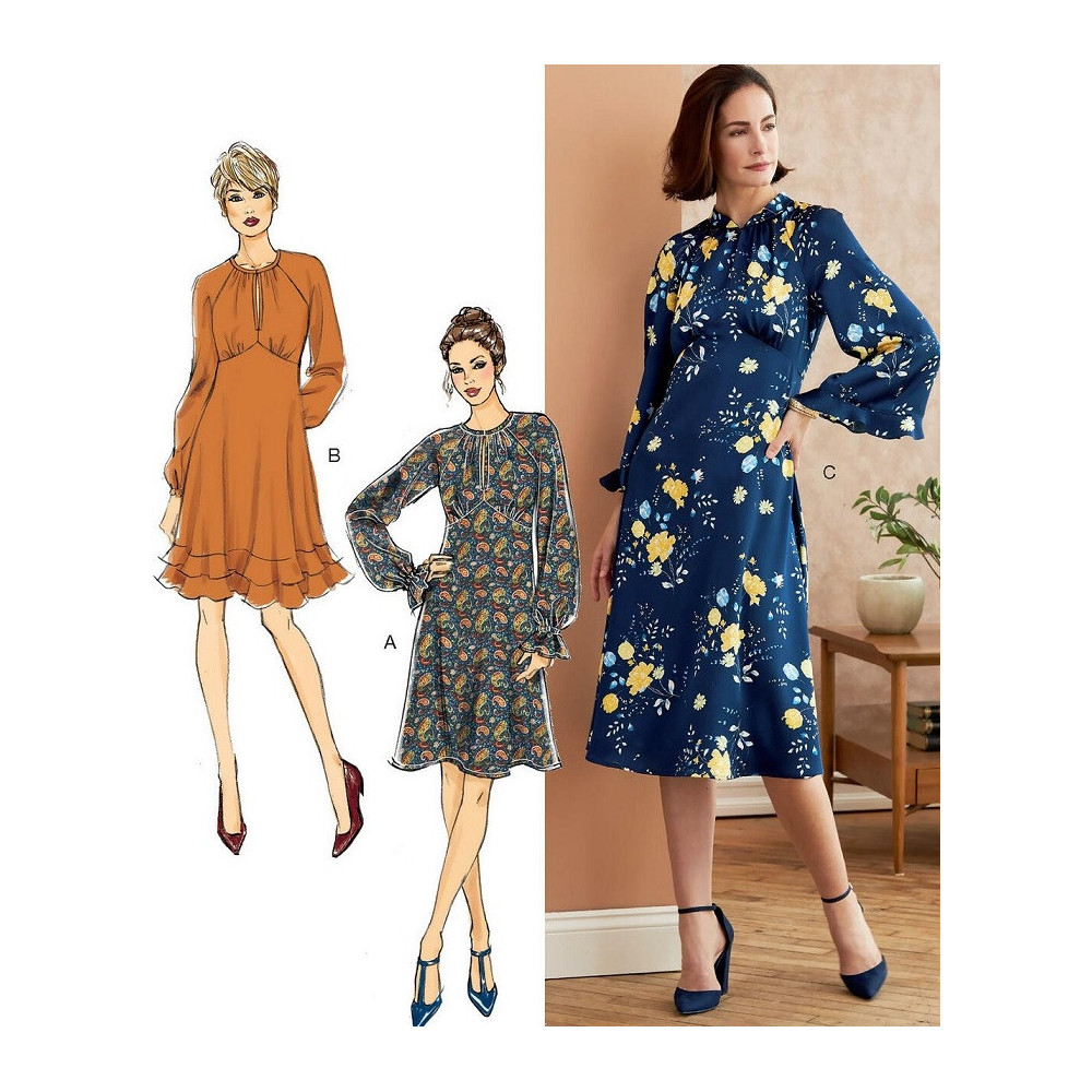 Střih Butterick na áčkové šaty s řasením, průstřihem v dekoltu a variacemi rukávů