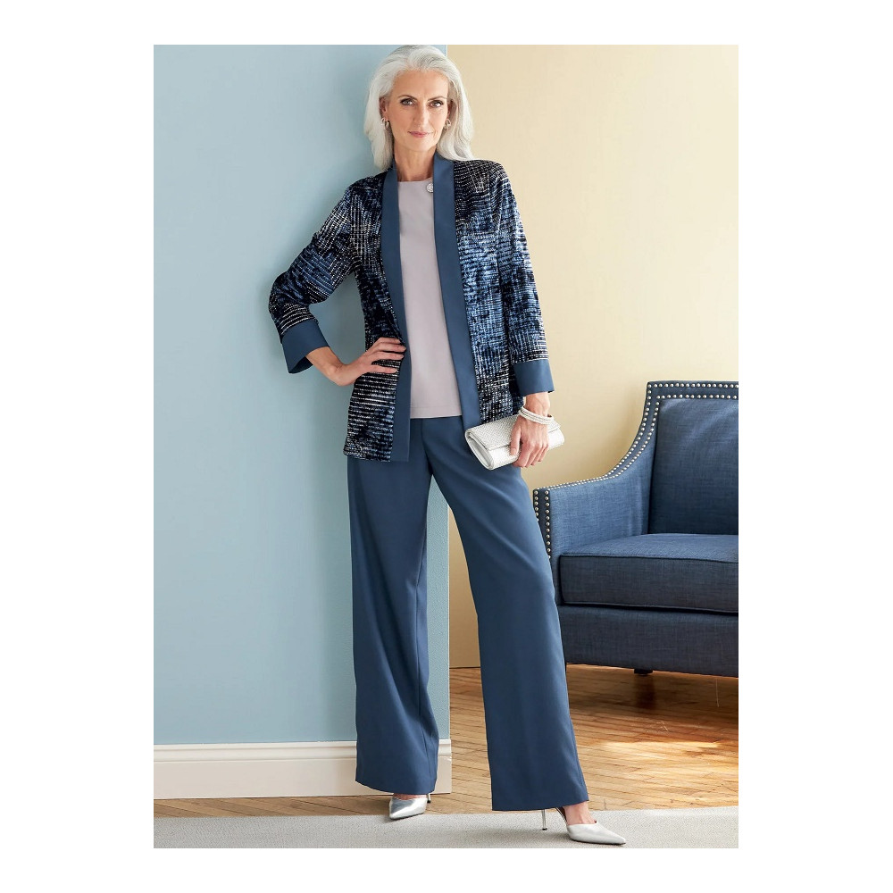 Návrhářský střih Vogue na kalhoty se širokými nohavicemi se sklady a dlouhý volný kabát bez límce...