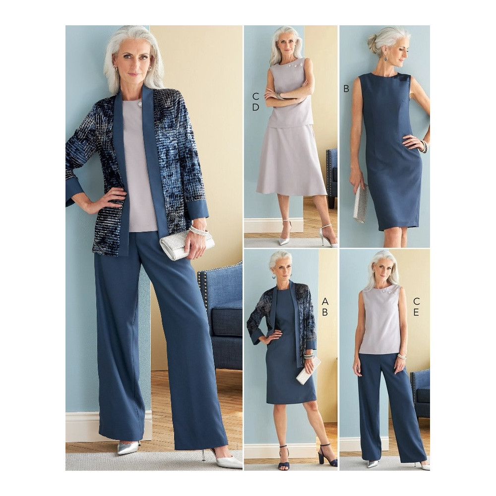 Střih Butterick na kombinaci: pouzdrové šaty, otevřené sako, top, sukně a kalhoty