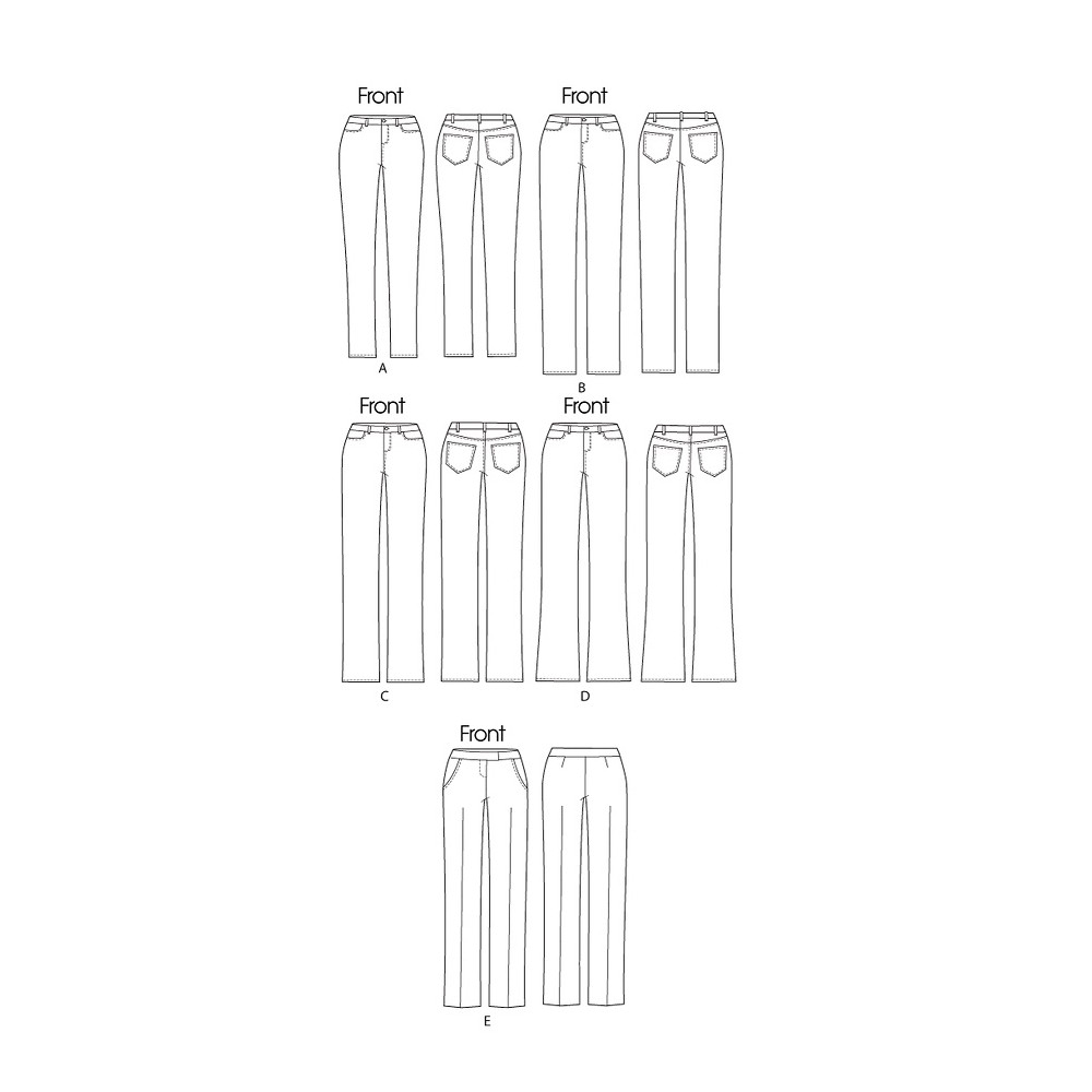 Střih Butterick na džíny A: úzké (délka ke kotníkům), B: rovné, C: boot cut, D: zvonové