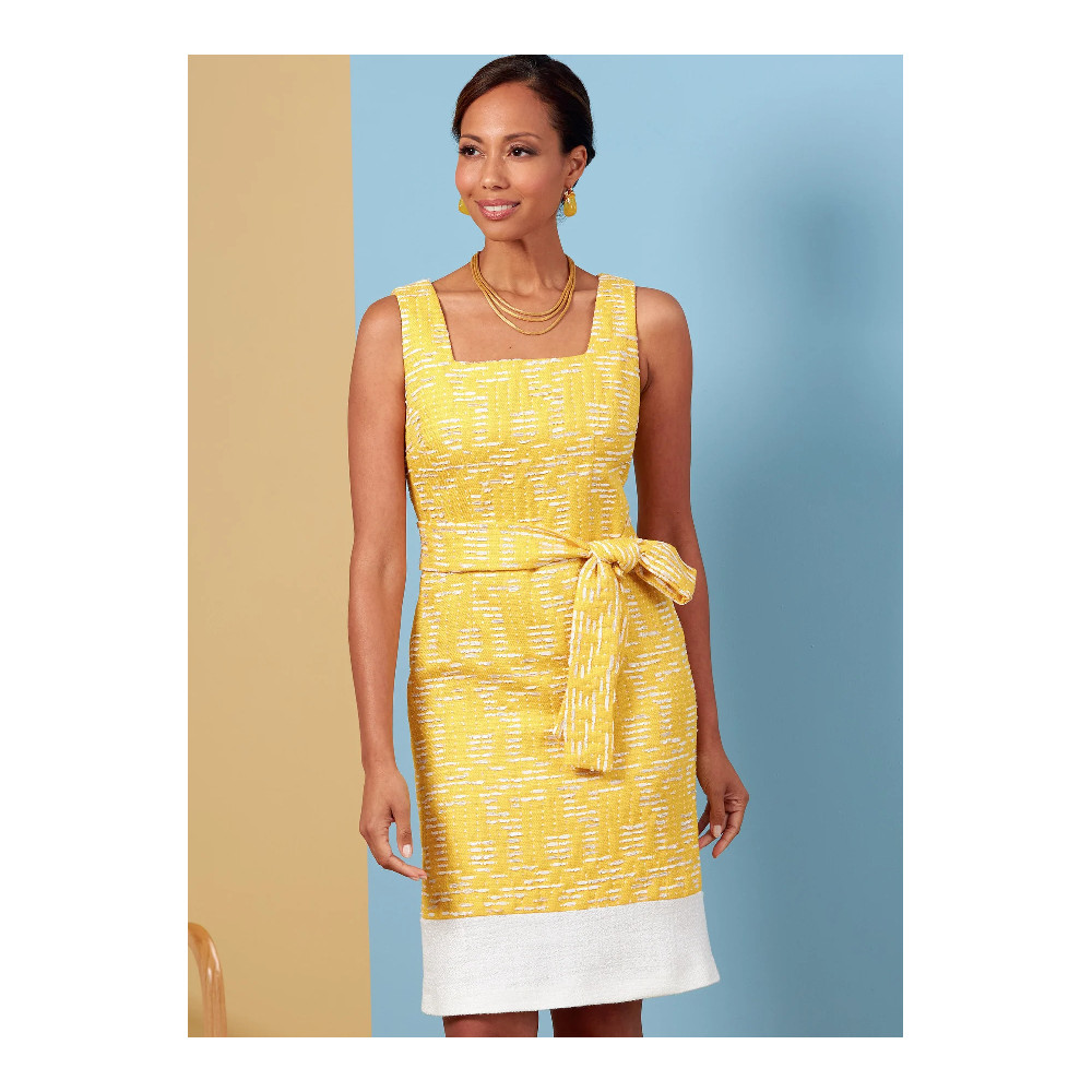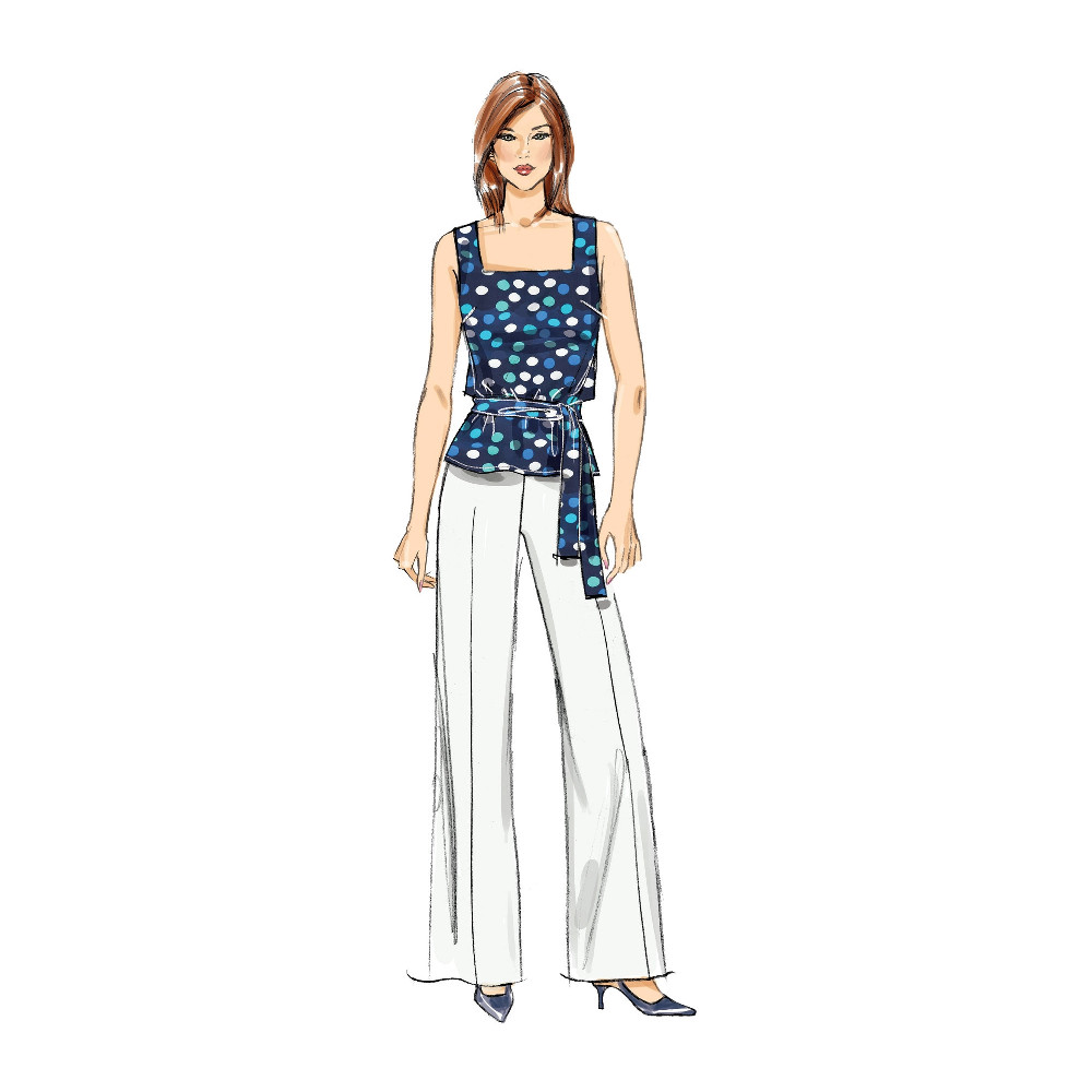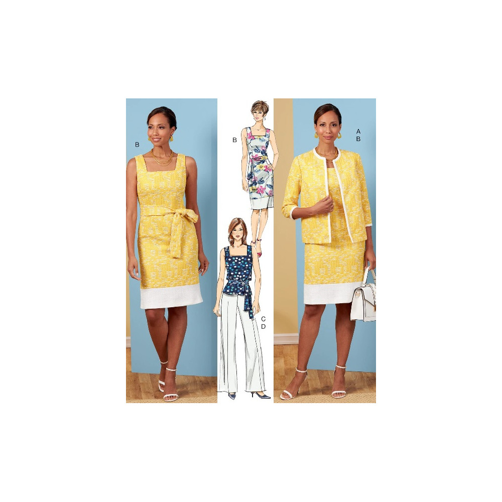 Střih Butterick na šaty s čtvercovým výstřihem, otevřené sako, top a kalhoty s puky