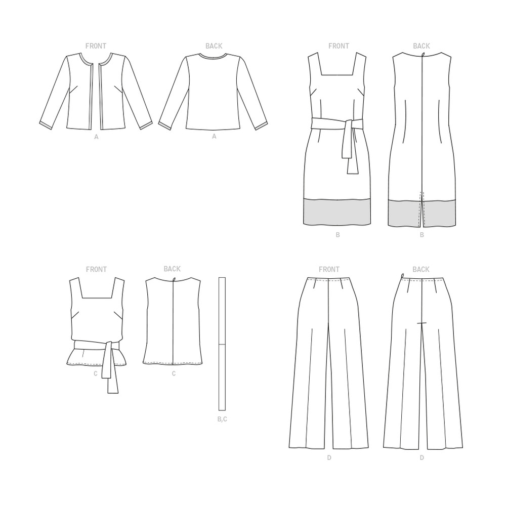 Střih Butterick na kombinaci: pouzdrové šaty, otevřené sako, top, sukně a kalhoty
