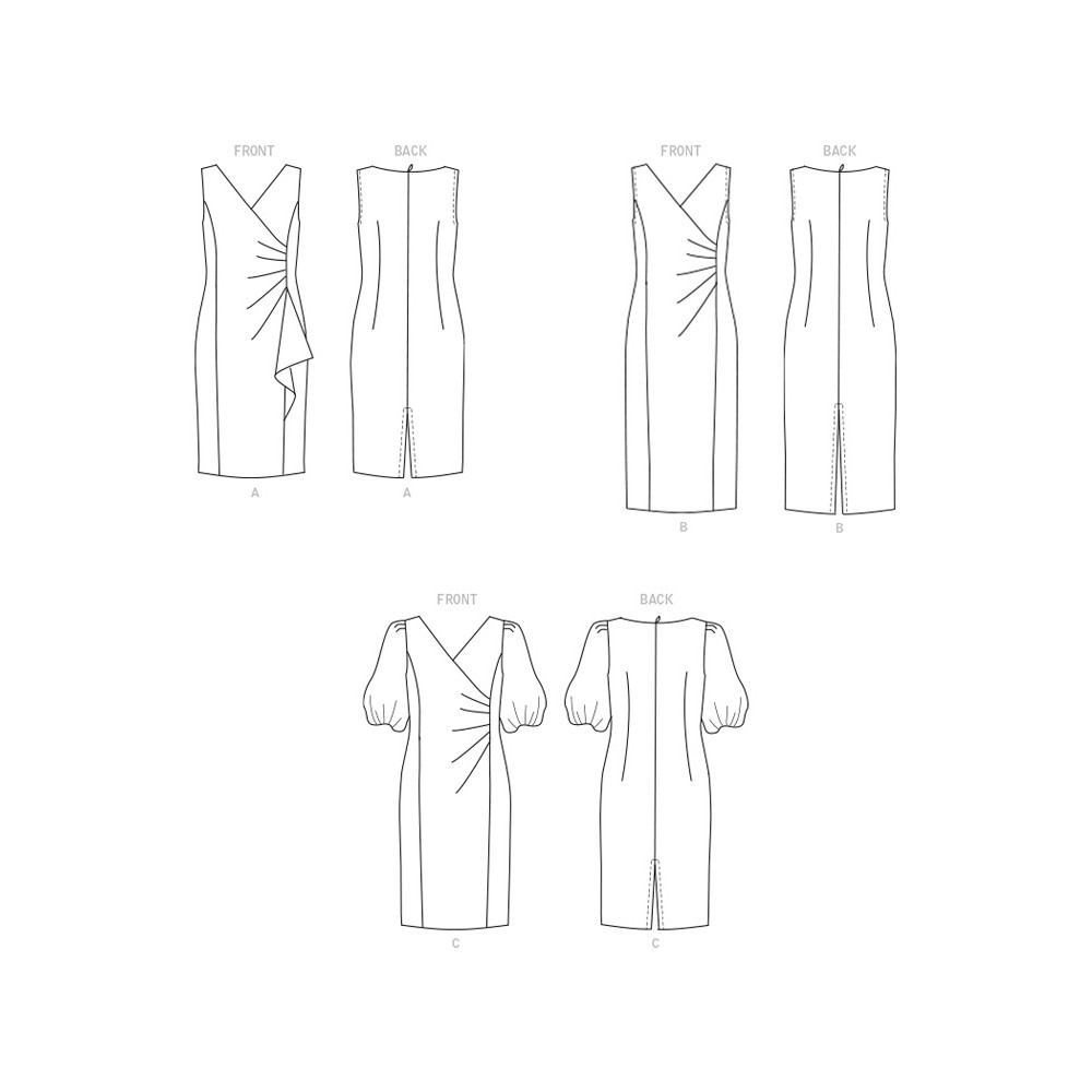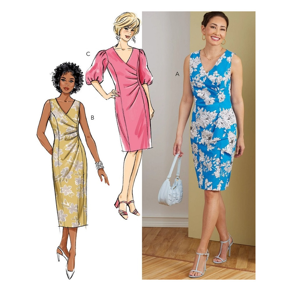 Střih Butterick na šaty bez rukávů se zavinováním, princesovými švy, řasením a drapé