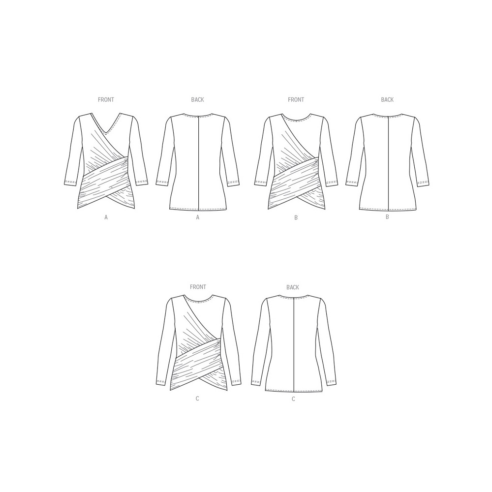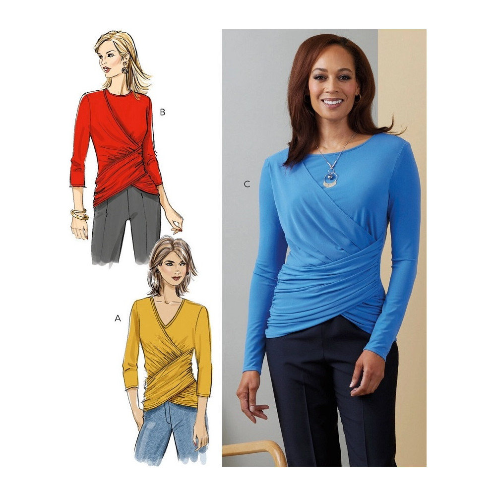 Střih Butterick na tričko s překřížením a řasením na předním dílu a 3/4 rukávy