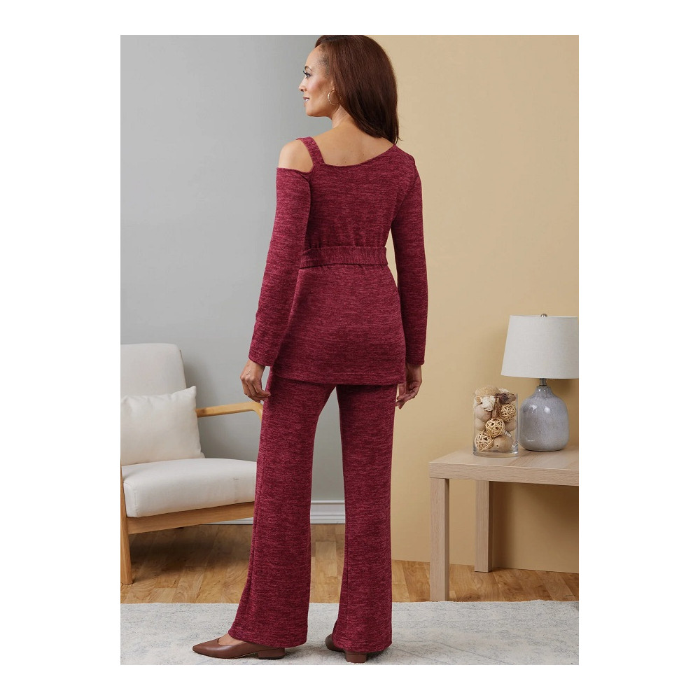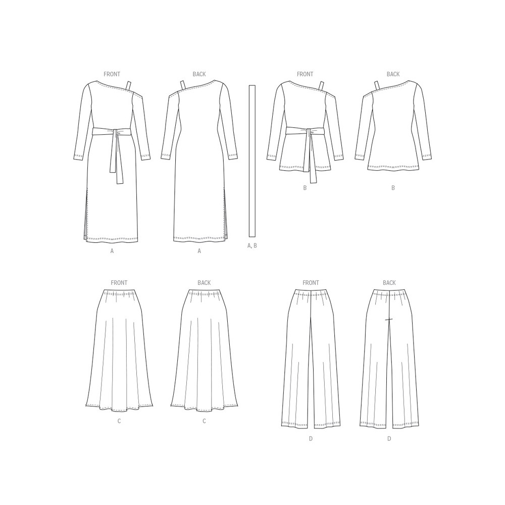 Střih Butterick na úpletové šaty, top na jedno rameno, zvonovou sukni a kalhoty s gumou v pase