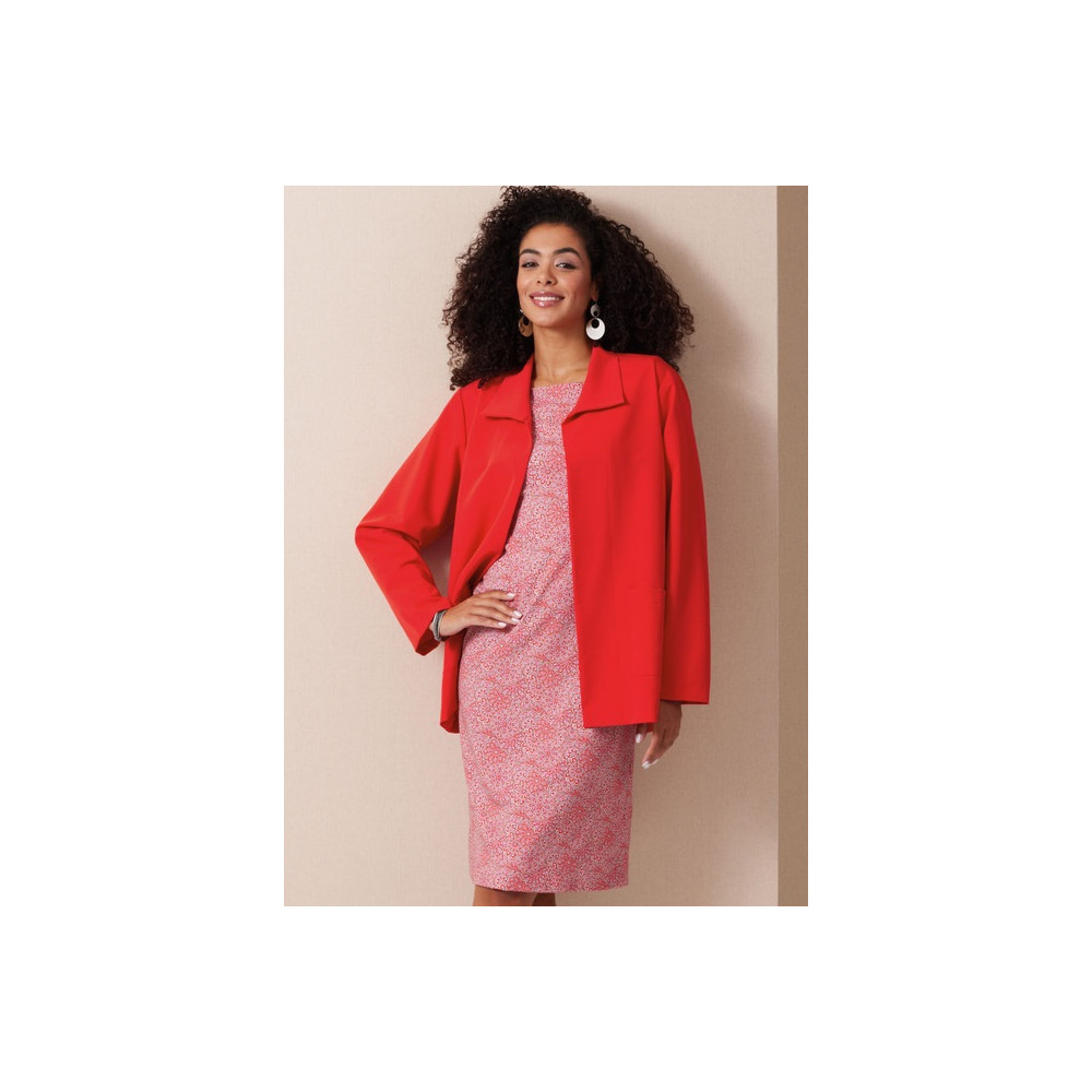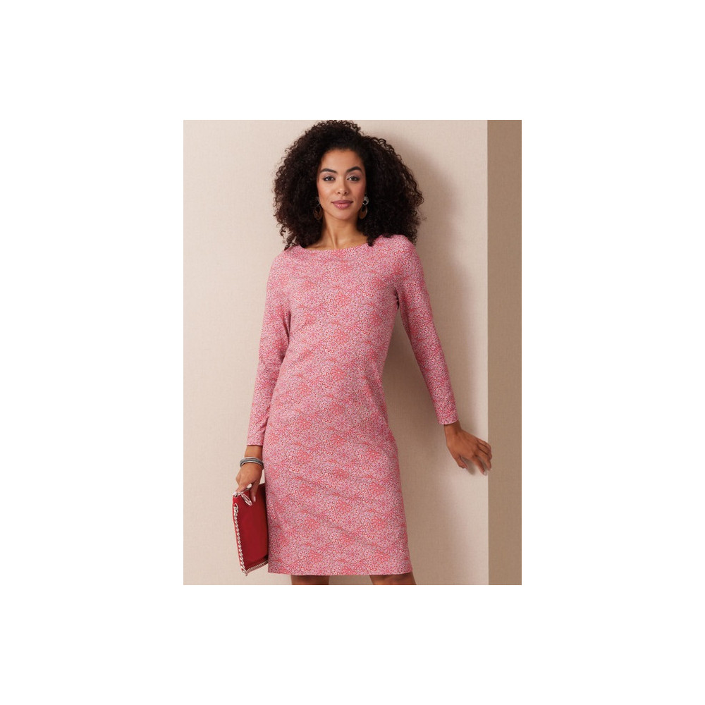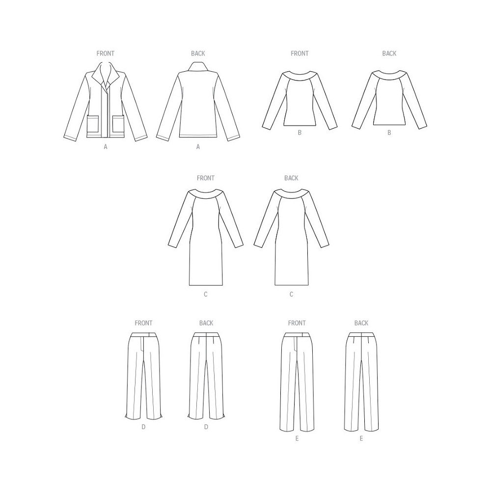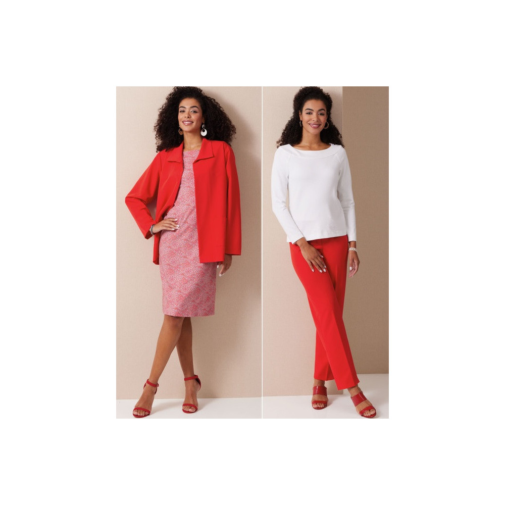 Střih Butterick na rovné šaty a tričko s raglánovými rukávy, sako s našitými kapsami a kalhoty s rovnými nohavicemi s puky a tvarujícími záševky