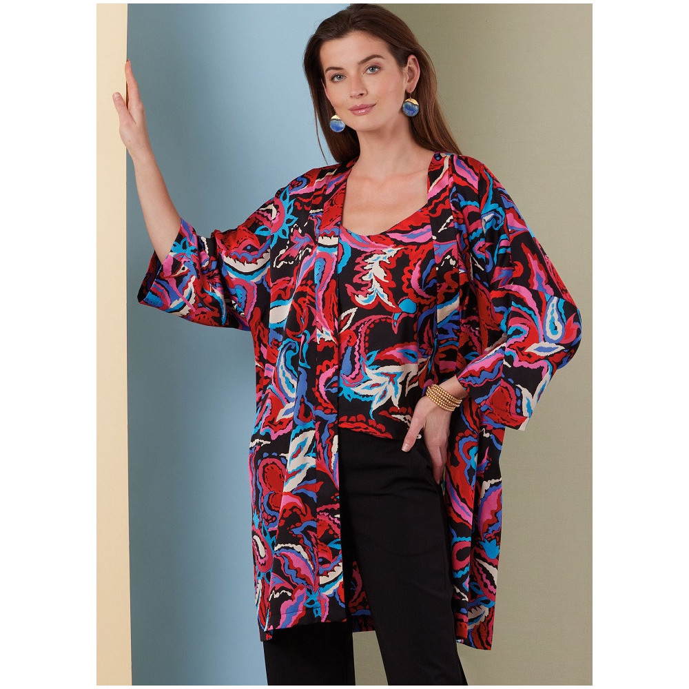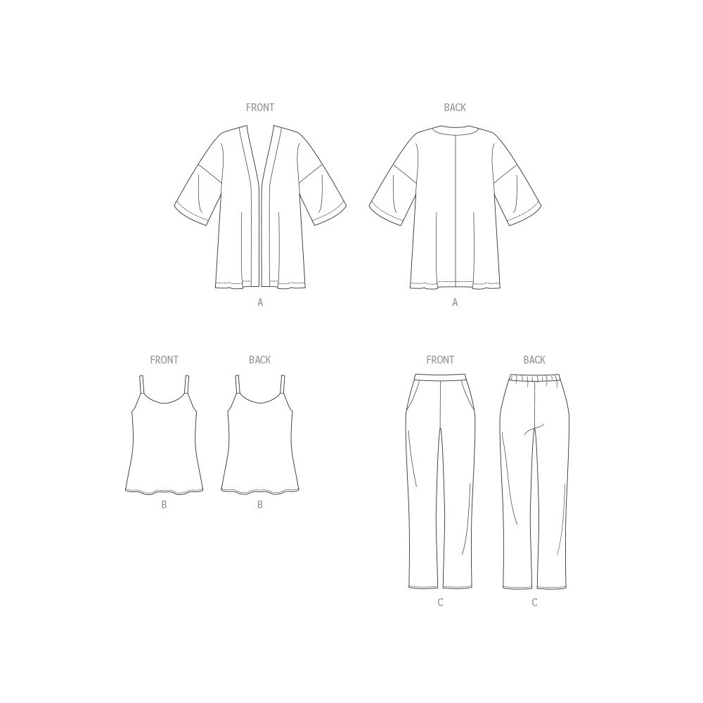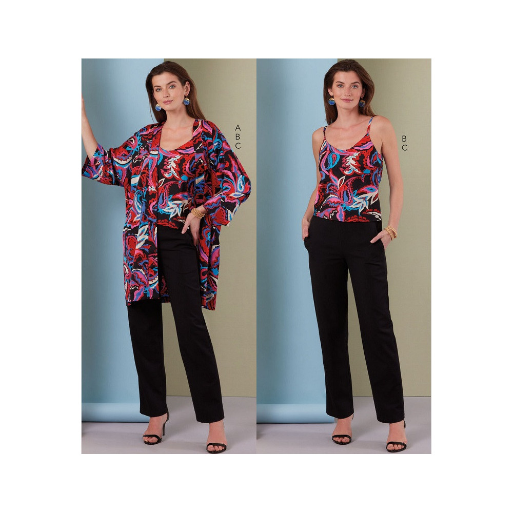 Střih Butterick na volné otevřené sako se sesazenými rameny, top na ramínka a kalhoty s gumou v zadním pasem