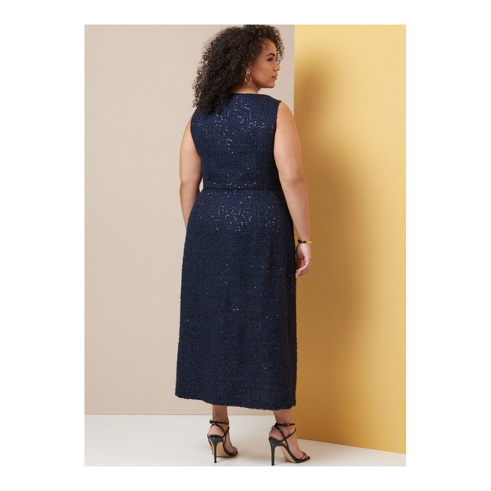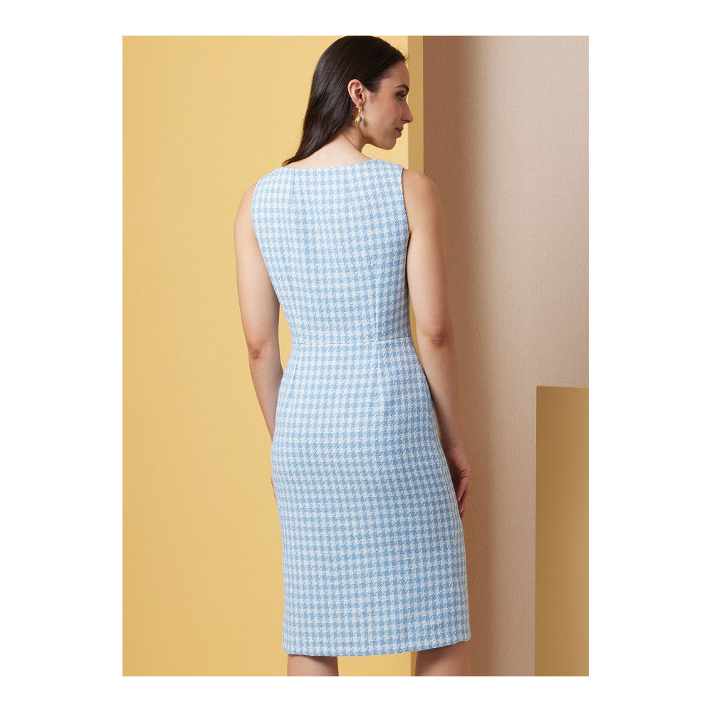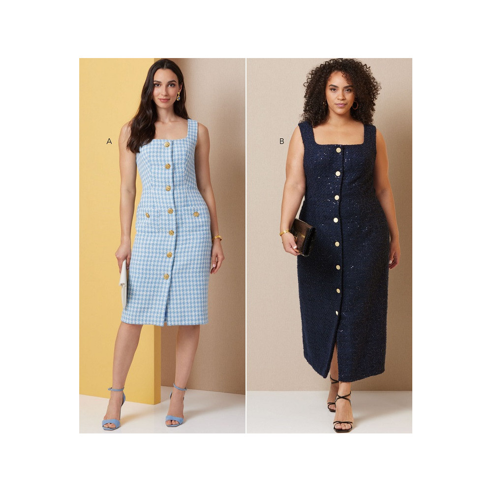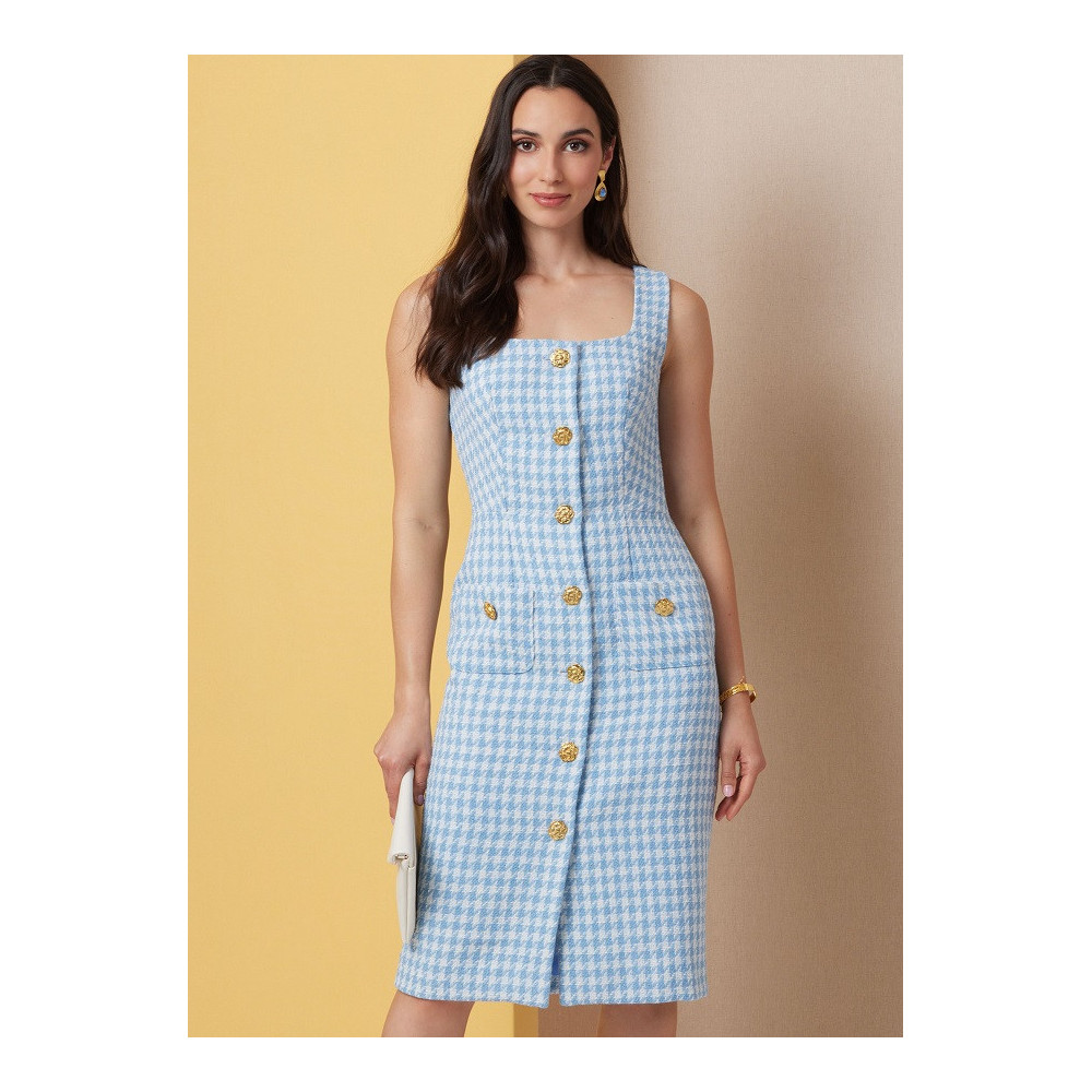 Střih Butterick na úzké šaty bez rukávů s předním zapínáním na knoflíky, čtvercovým výstřihem a tvarujícími záševky