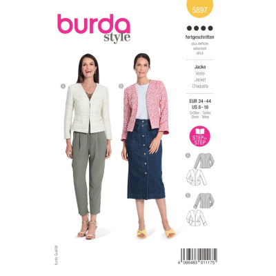 Střih Burda na otevřené krátké sako bez límce s tříčtvrtečními rukávy a kapsami