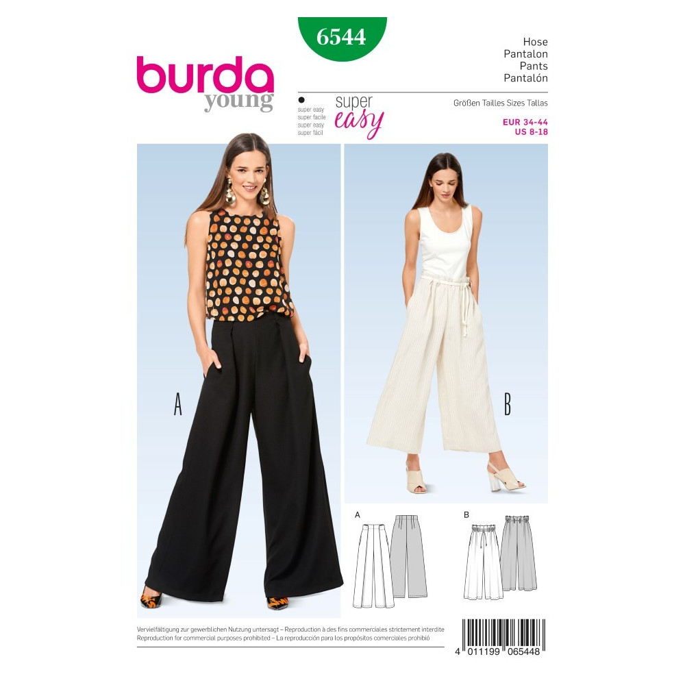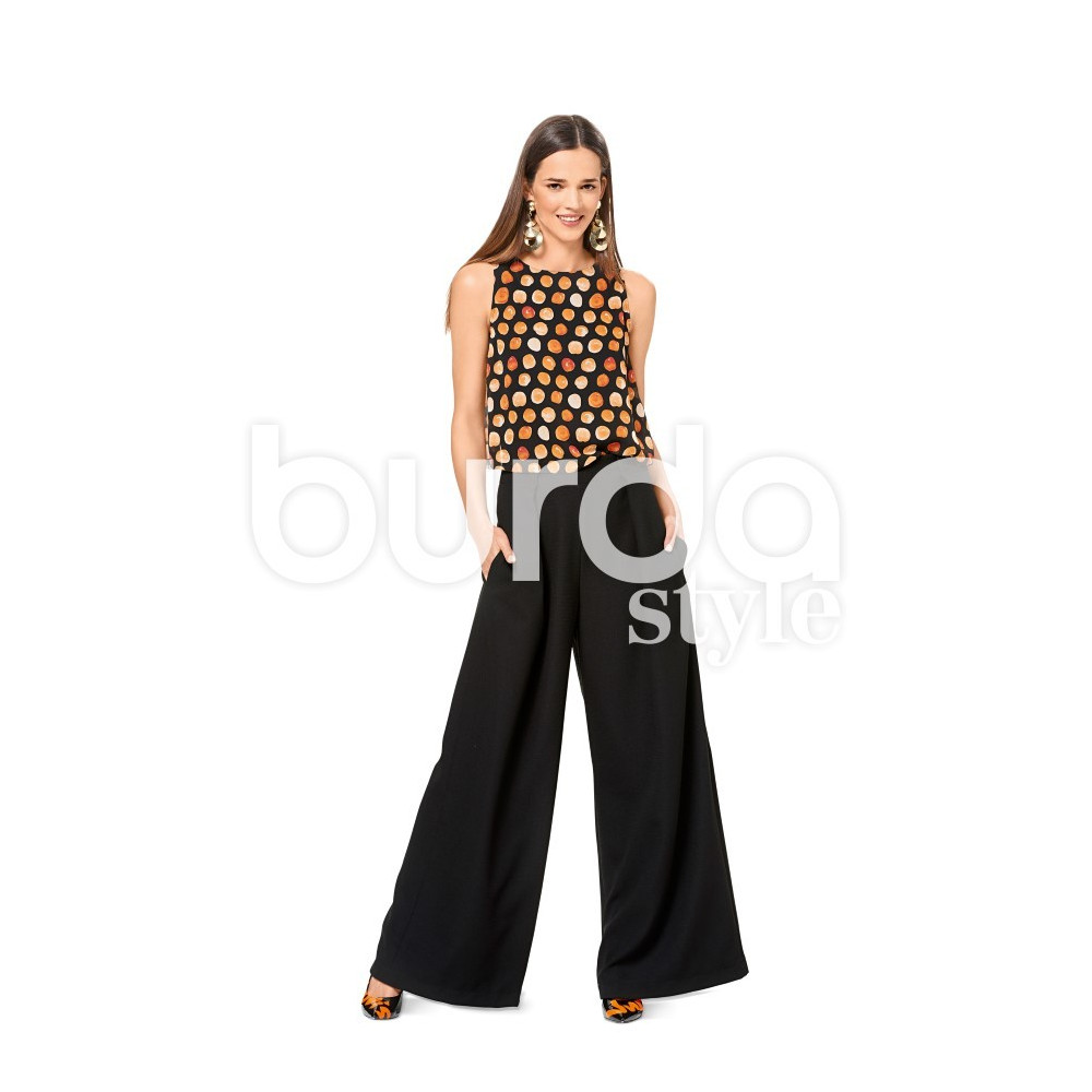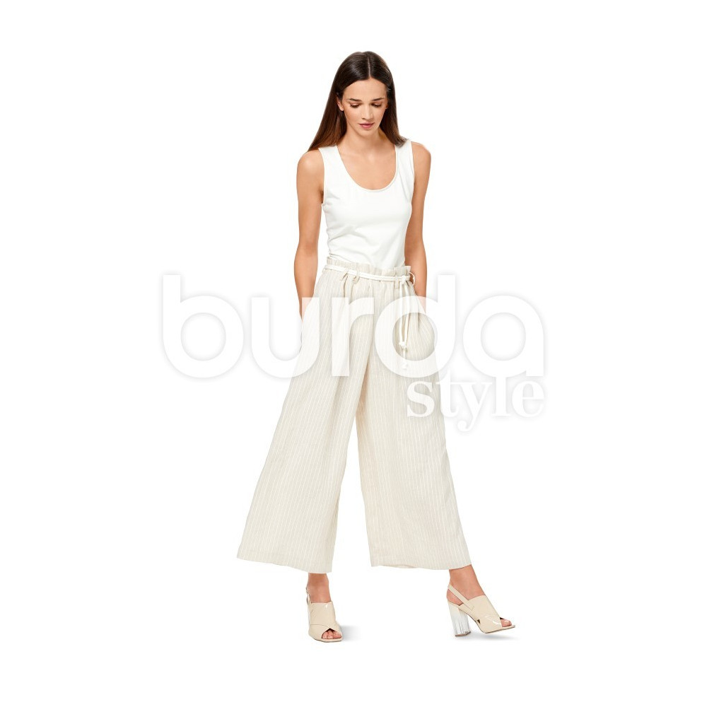 Střih Burda na kalhoty se širokými nohavicemi, vysokým pasem se sklady a kapsami.