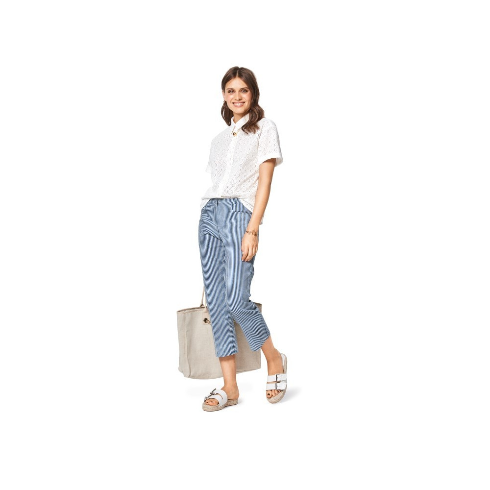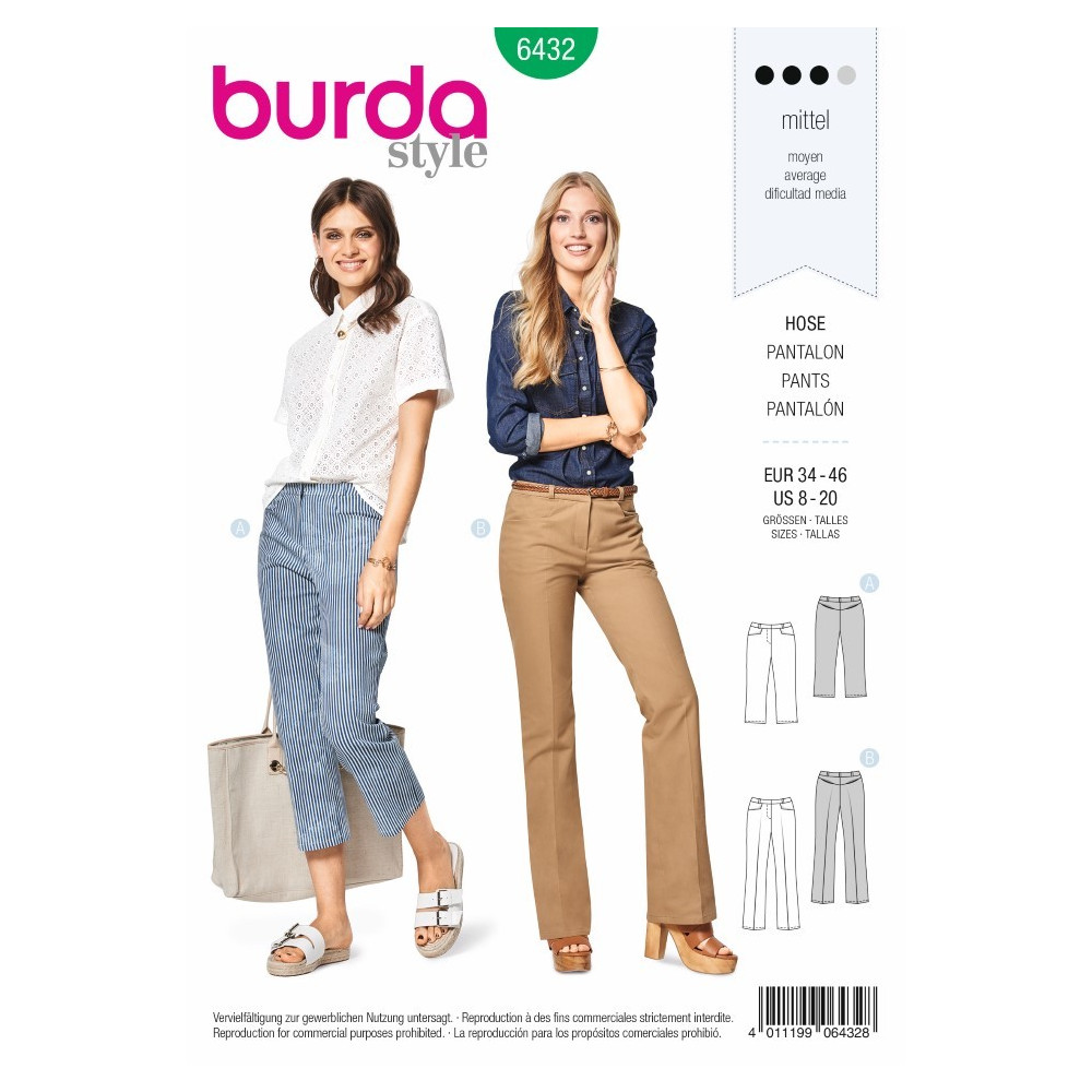 Střih Burda na tříčtvrteční kalhoty a rovné kalhoty se zažehlenými puky.