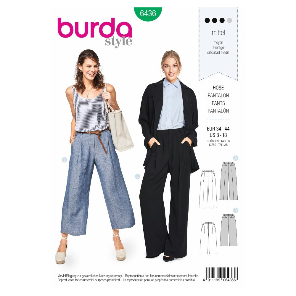 Střih Burda na kalhoty a kratší letní lněné kalhoty se širokými nohavicemi a záševky.