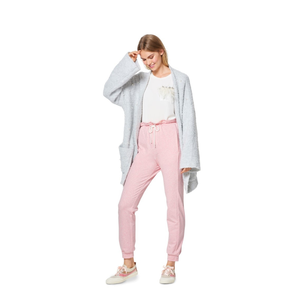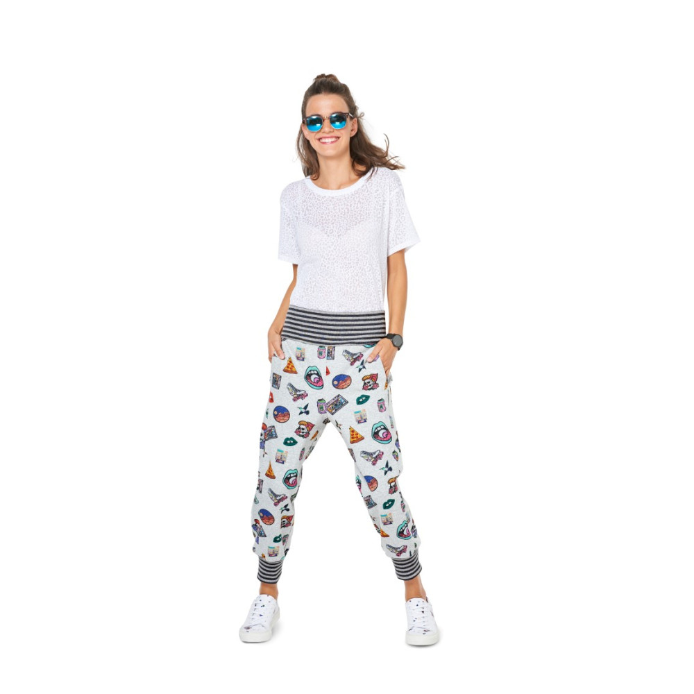 Střih Burda na pohodlné teplákové kalhoty s pružným pasem se šňůrkou nebo s nápletem.