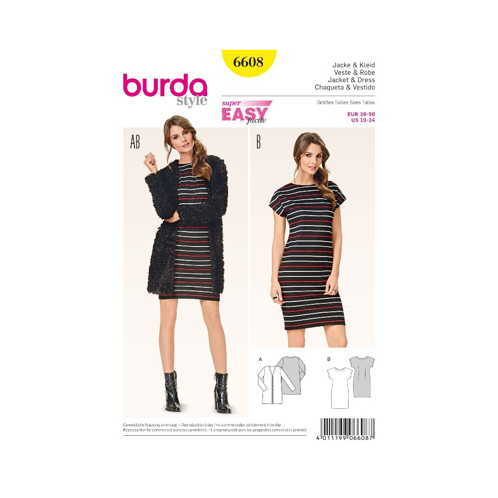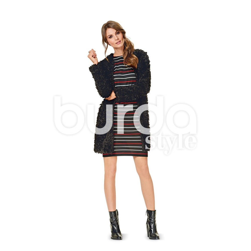Střih Burda na jednoduché úpletové šaty a jednoduchý kabátek bez zapínání.