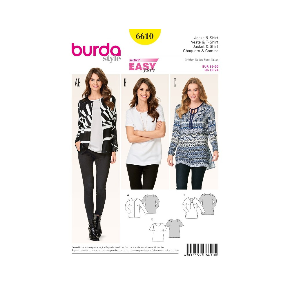 Střih Burda na jednoduché delší tričko, tuniku se zavazováním a bočními rozparky a blejzr.