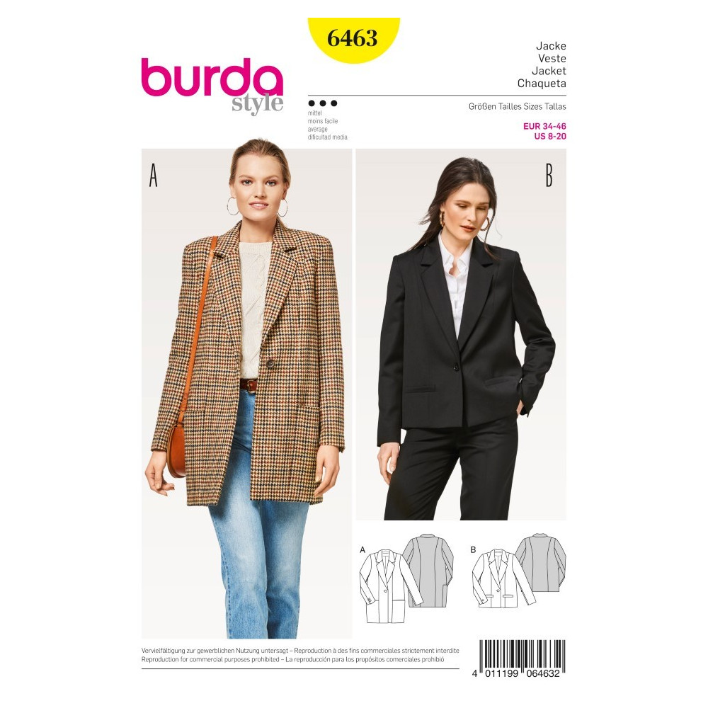 Střih Burda na volné sako na jeden knoflík ve dvou délkách pro různé příležitosti.