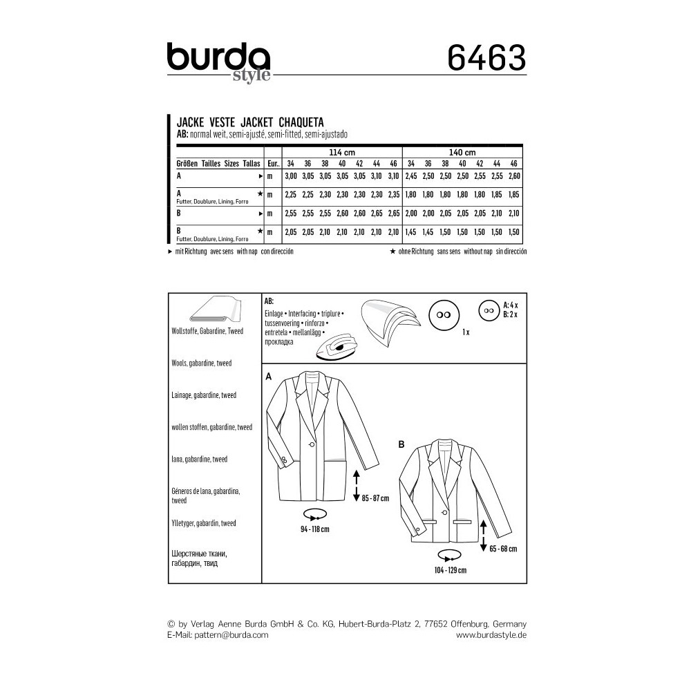 Více se dočtete v popisuStřih ve velikostech EUR 34-46, úroveň obtížnosti šití: 3 (střední), doporučené látky: vlněné látky, gabardén, tvíd