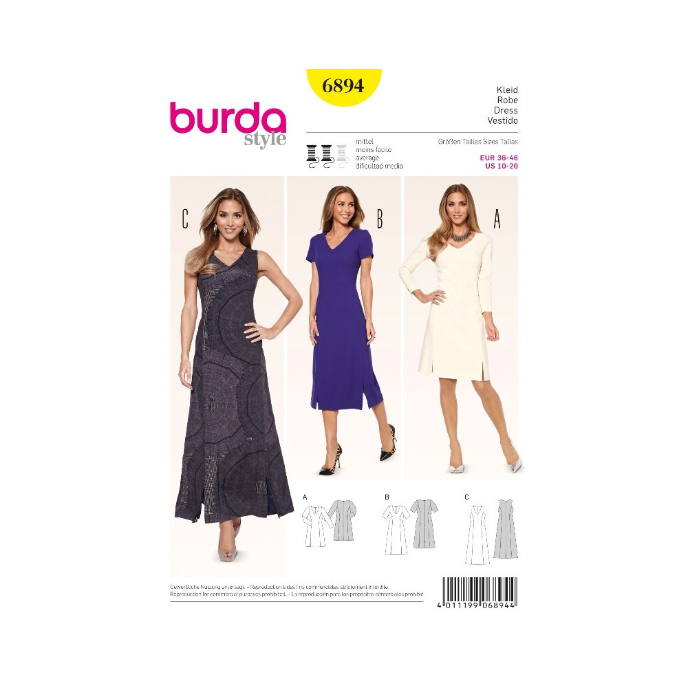 Střih Burda na áčkové šaty v různých délkách s dílovými švy zakončenými rozparky.