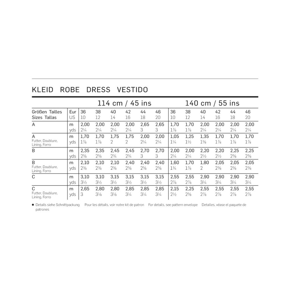Více se dočtete v popisuStřih ve velikostech EUR 36-46, úroveň obtížnosti šití: 3 (střední), doporučené látky: vlněný satén, krepové látky, bavlna