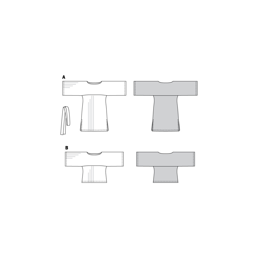 Více se dočtete v popisuStřih ve velikostech EUR 34-44, úroveň obtížnosti šití: 1 (velmi lehká), doporučené látky: pouze strečové látky (žerzej, úplet)