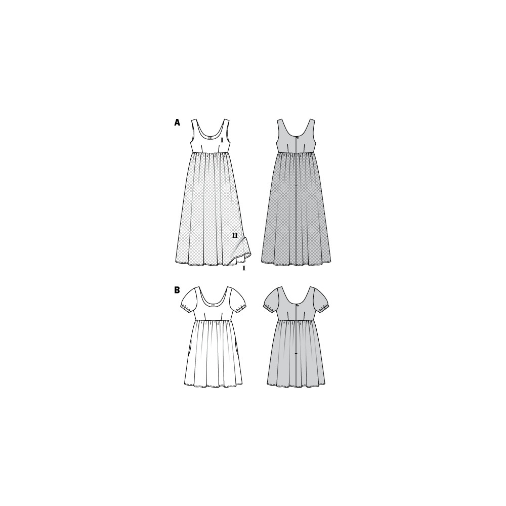 Střih ve velikostech EUR 32-44, úroveň obtížnosti šití: 3 (střední), doporučené látky: satén, tyl, bavlna, krepové látky