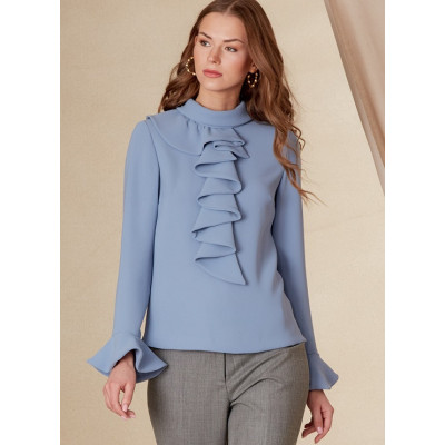 Střih Vogue na halenku s variantami rukávů, kaskádovým volánem a propínáním na zádech