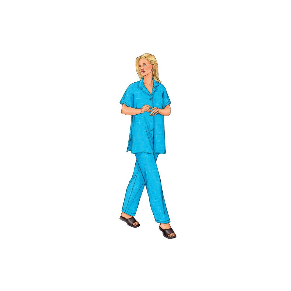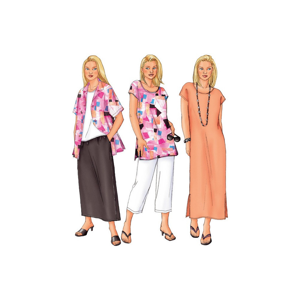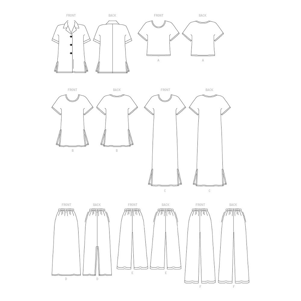 Střih Butterick na tričkové šaty, tuniku a košili s bočními rozparky, tričko a áčkovou sukni a kalhoty s gumou v pase