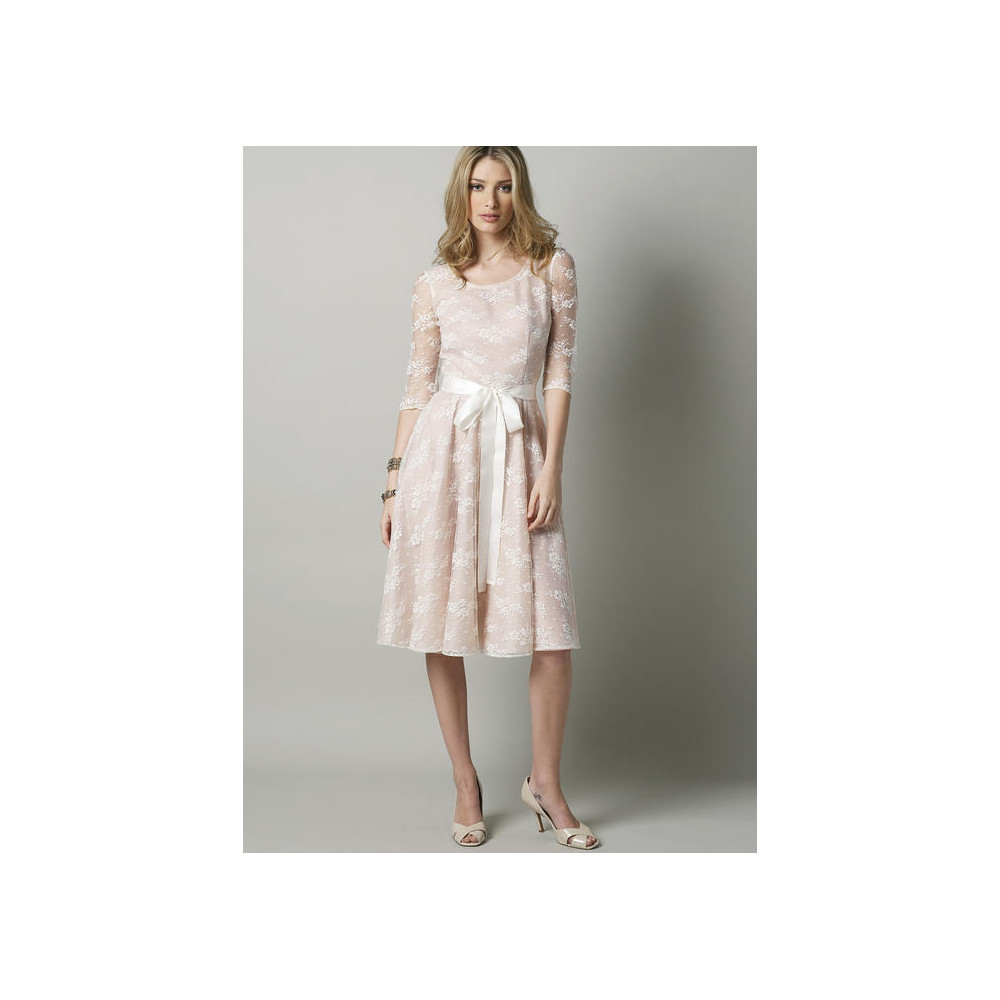 Střih Vogue na šaty ke krku s volánovými rukávy, skrytou přední knoflíkovou légou, princesovými...