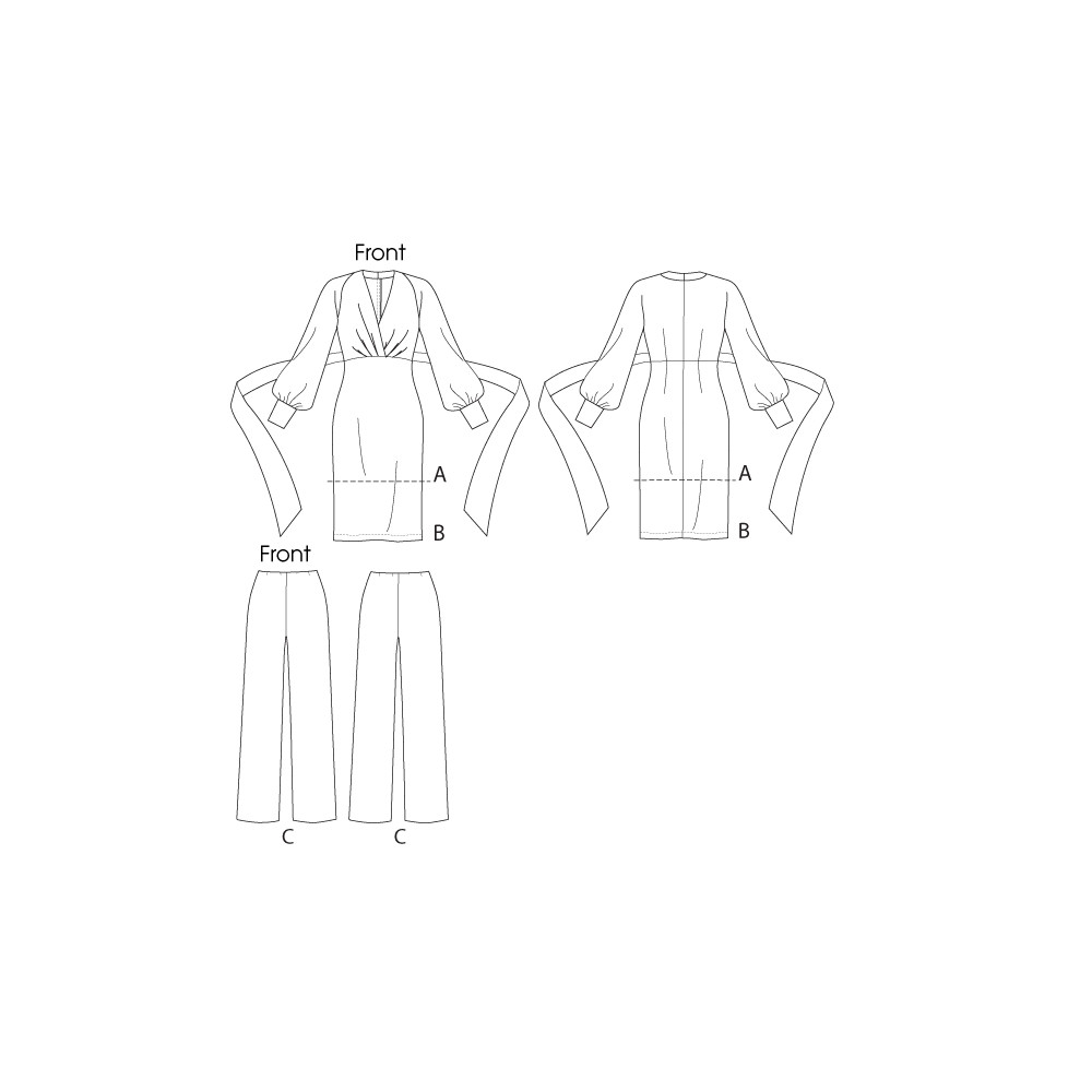 Střih Vogue na šaty / tuniku s balonovými rukávy s manžetami a kalhoty.