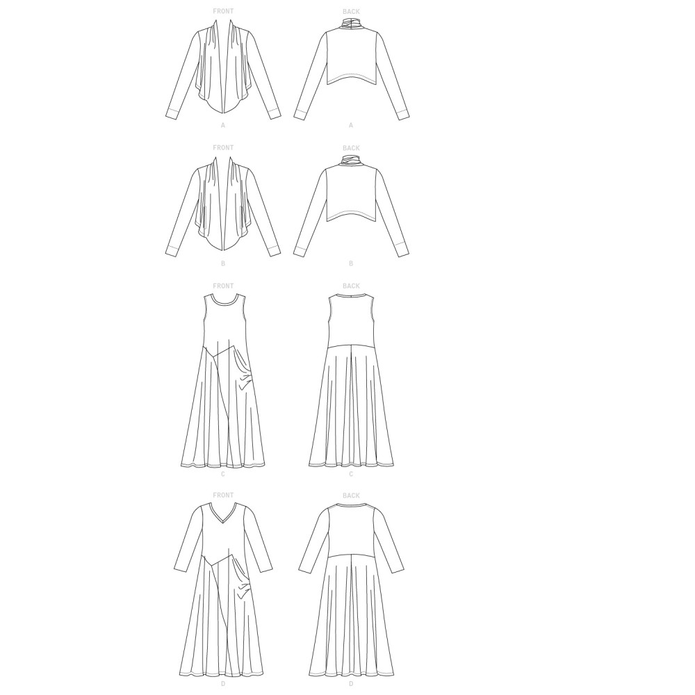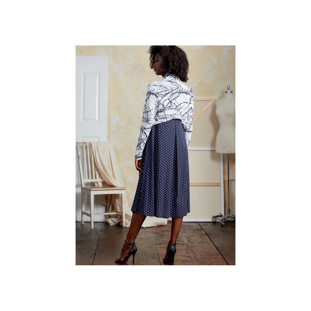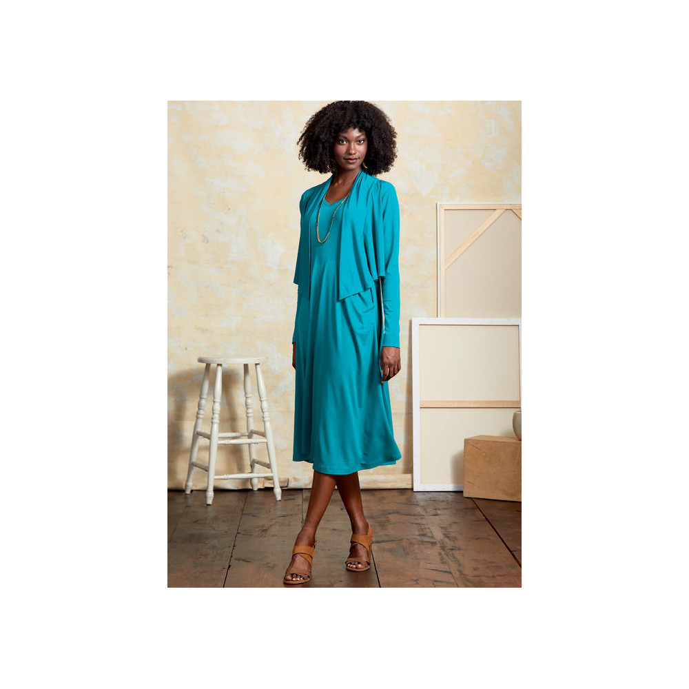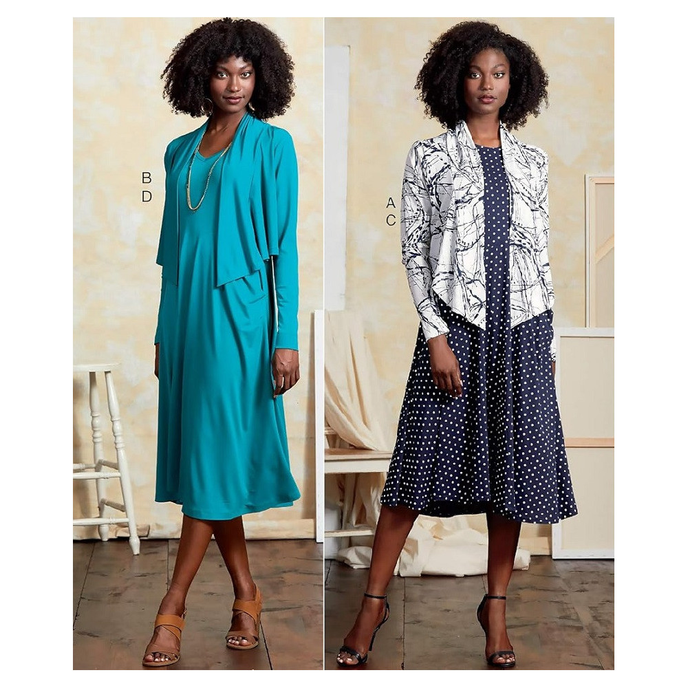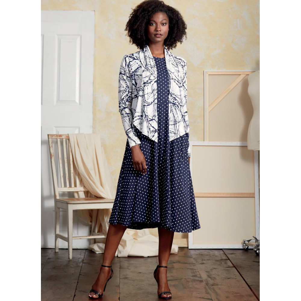 Střih Vogue na tričkové šaty s asymetrickou sukní a kardigan se šálovým límcem