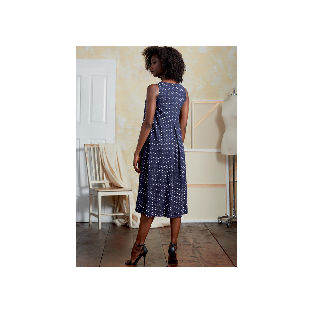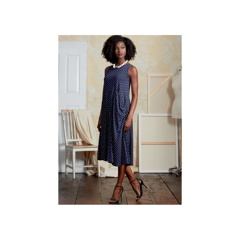 Střih Vogue na áčkové šaty bez rukávů se sukní ve dvou délkách se sklady.