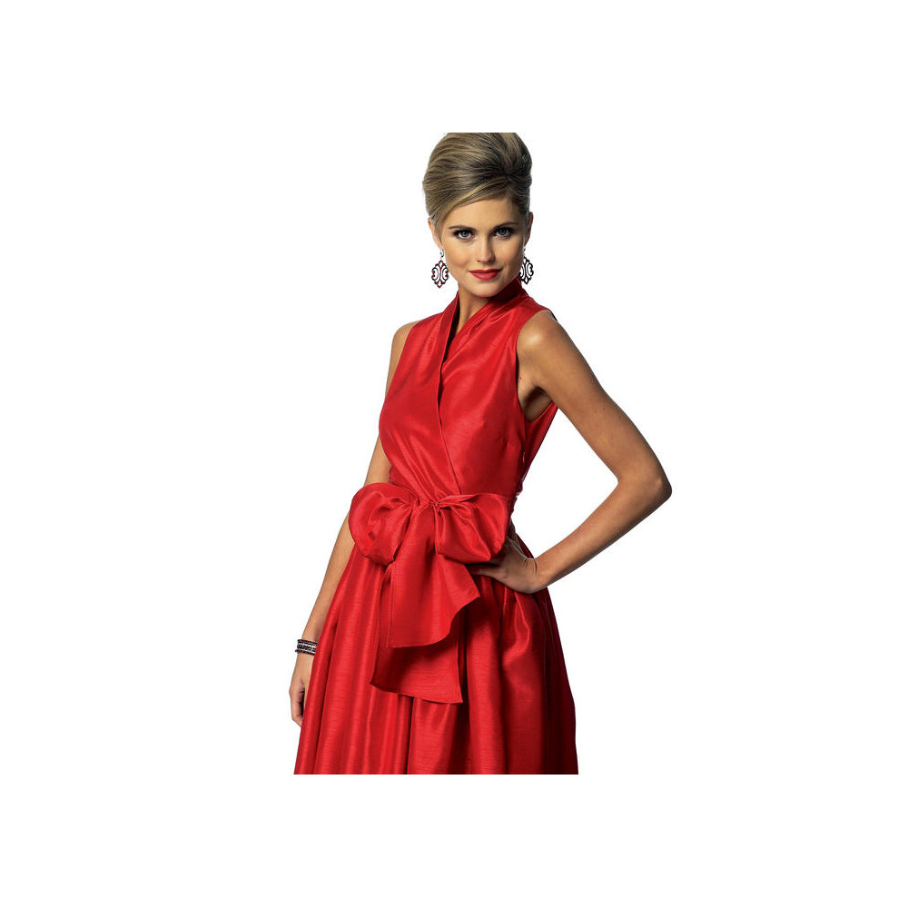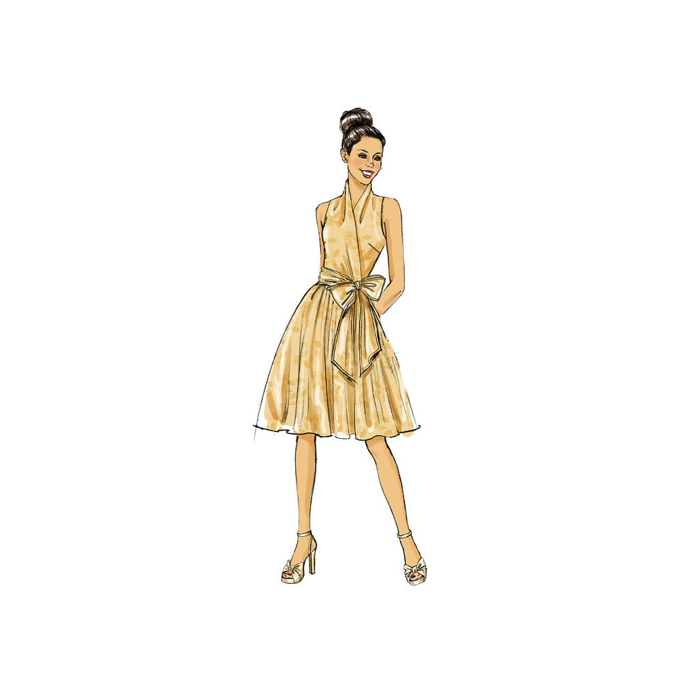 Střih Vogue na šaty za krk se širokým límcem, tvarujícími sklady a rozšiřující se dlouhou sukní
