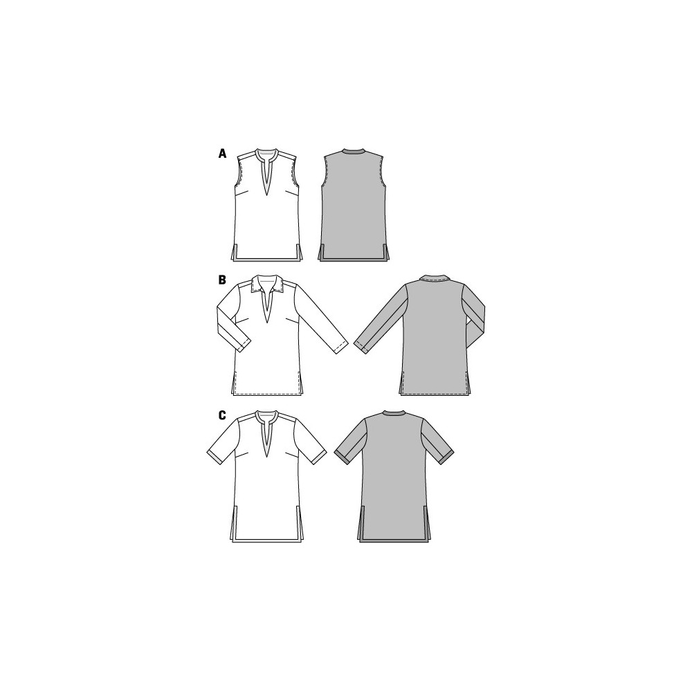Střih Burda na tuniku v různých délkách a rukávech, s průstřihem a bočními rozparky.