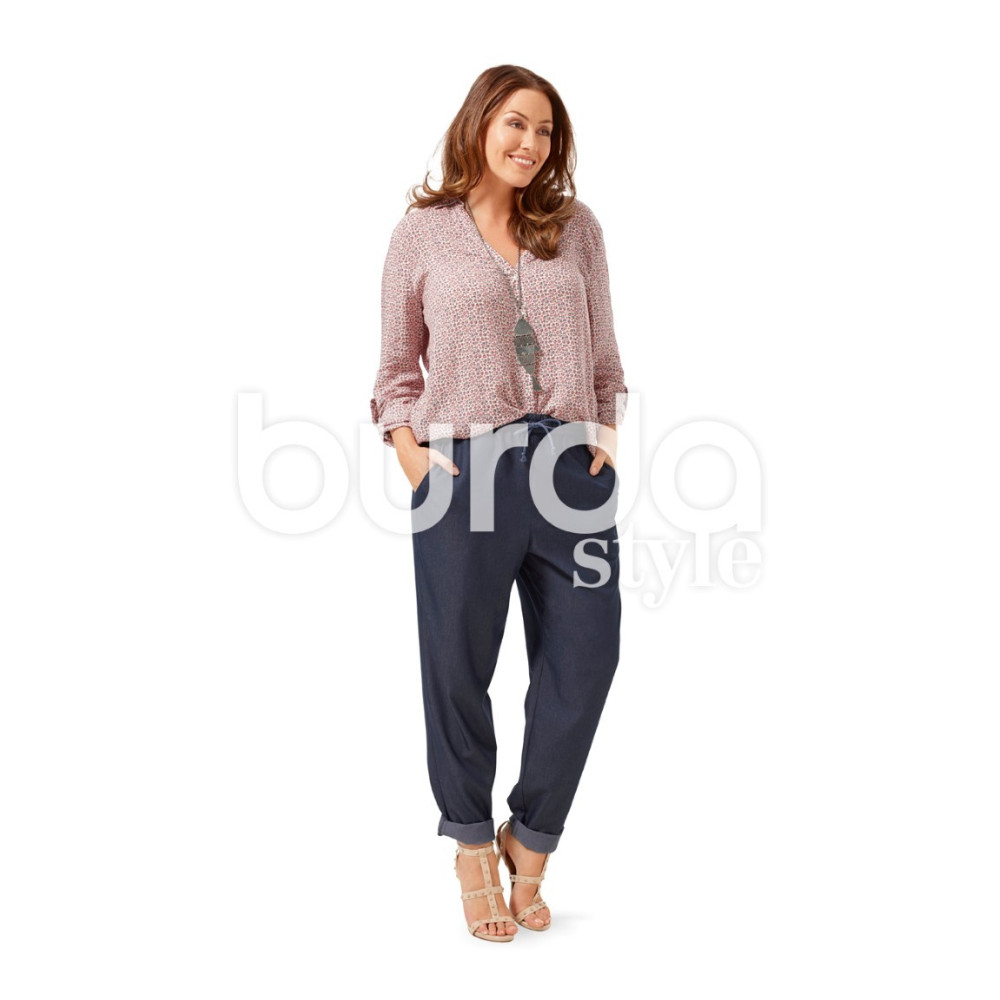 Střih Burda na pohodlné kalhoty s kapsami a pasem do gumy a stahovací šňůrkou.