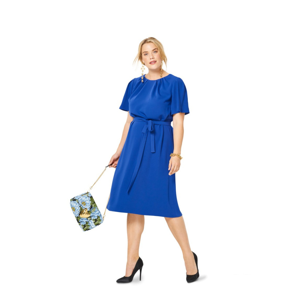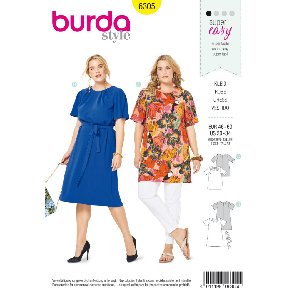 Střih Burda na pohodlné volnější šaty s delším rukávem nebo delším zvonovým rukávem.