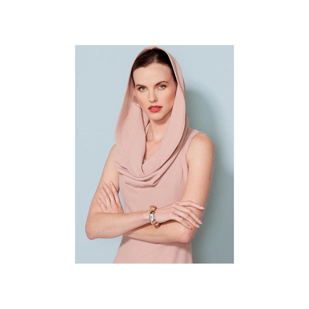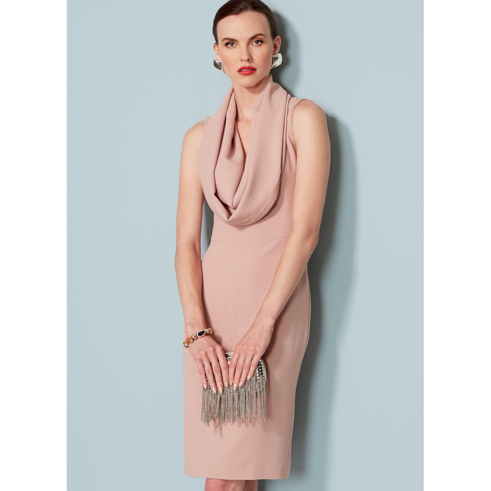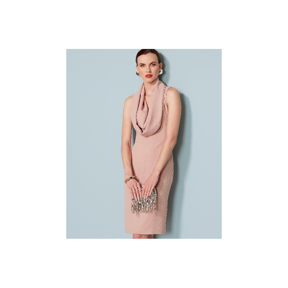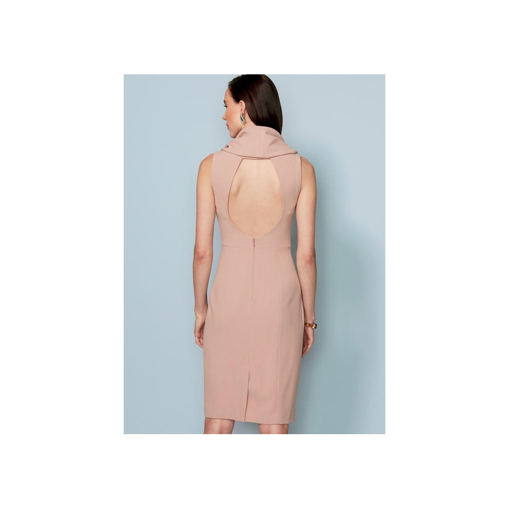 Návrhářský střih Vogue na pouzdrové šaty s výstřihem na zádech a variabilním límcem