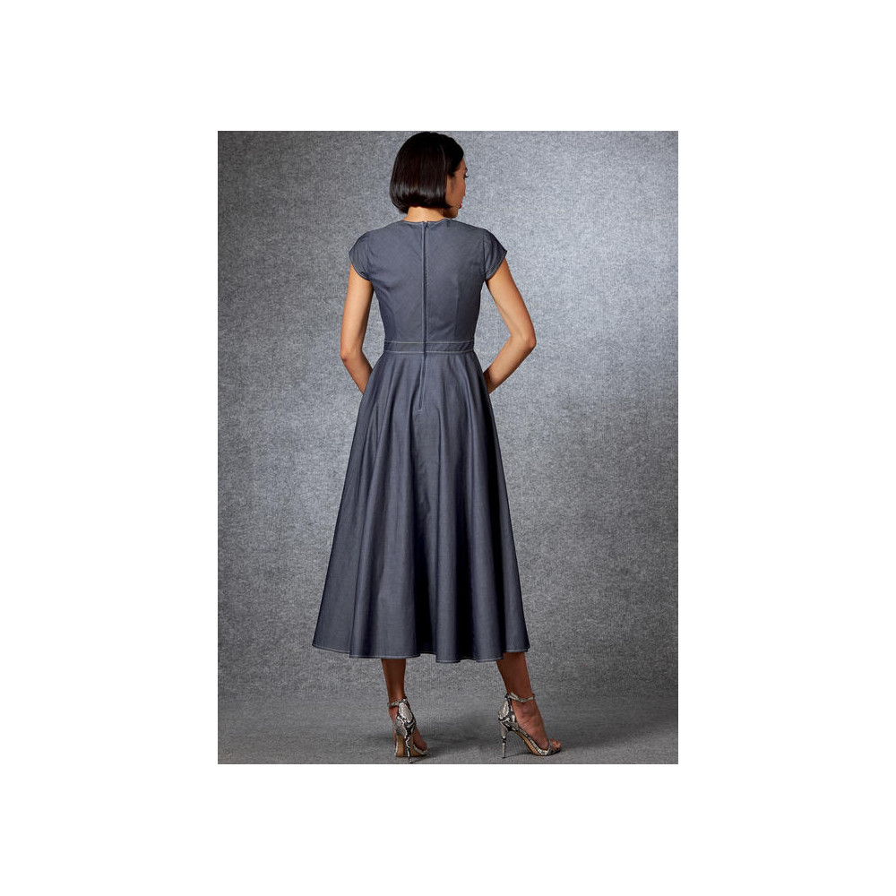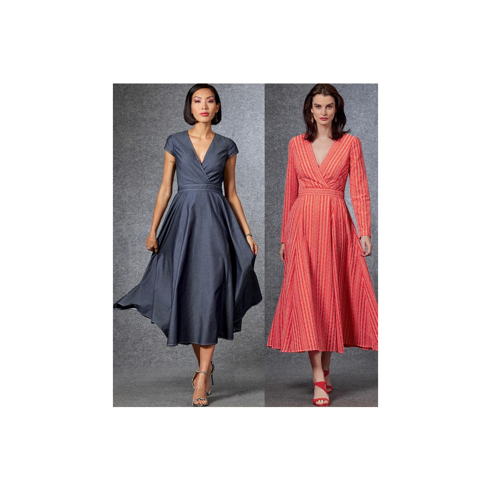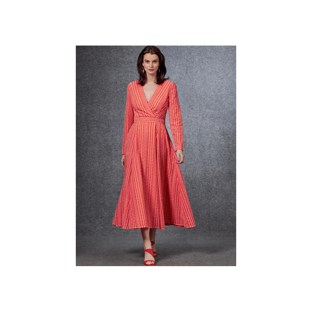 Střih Vogue na midi šaty s V-výstřihem, variacemi rukávů a širokou sukní