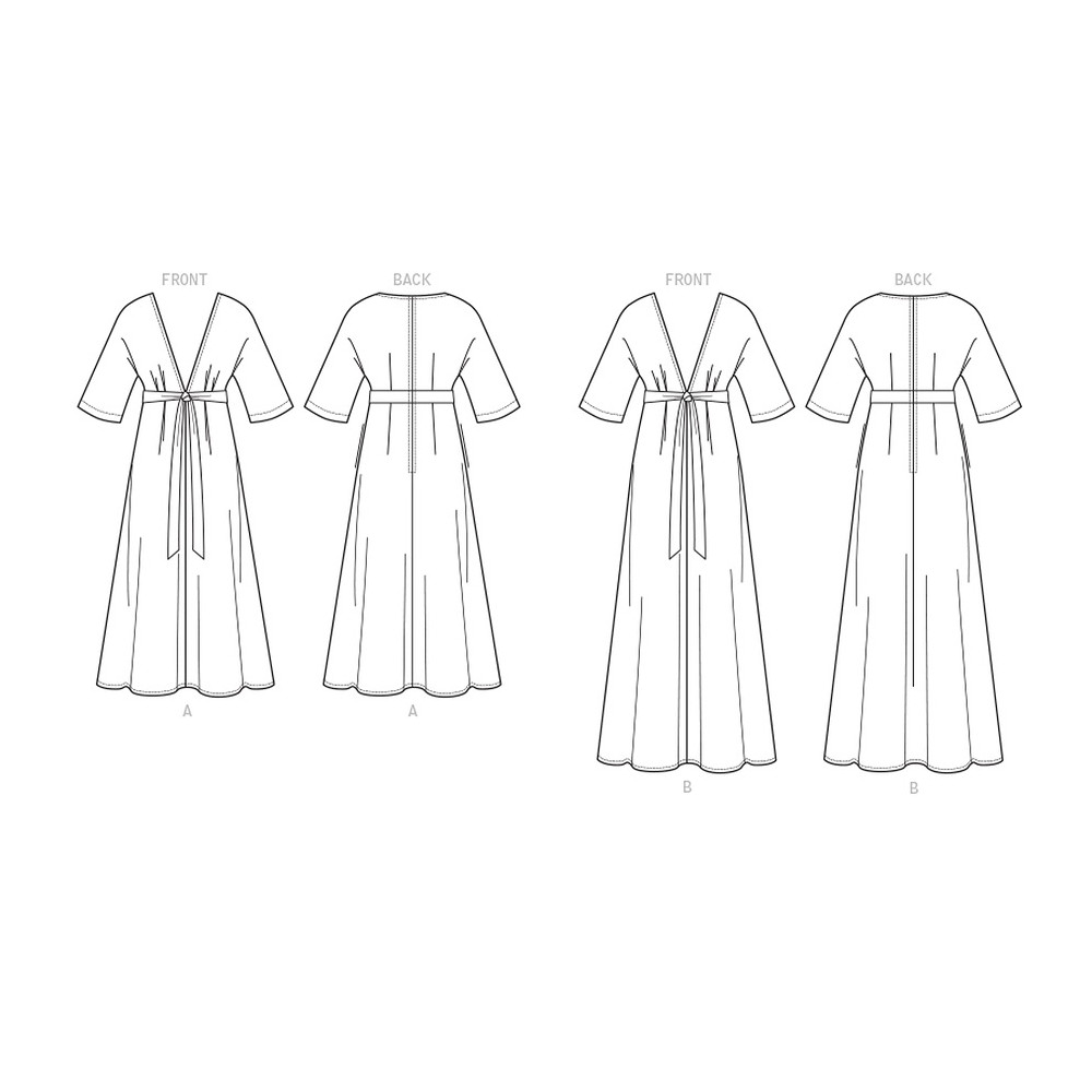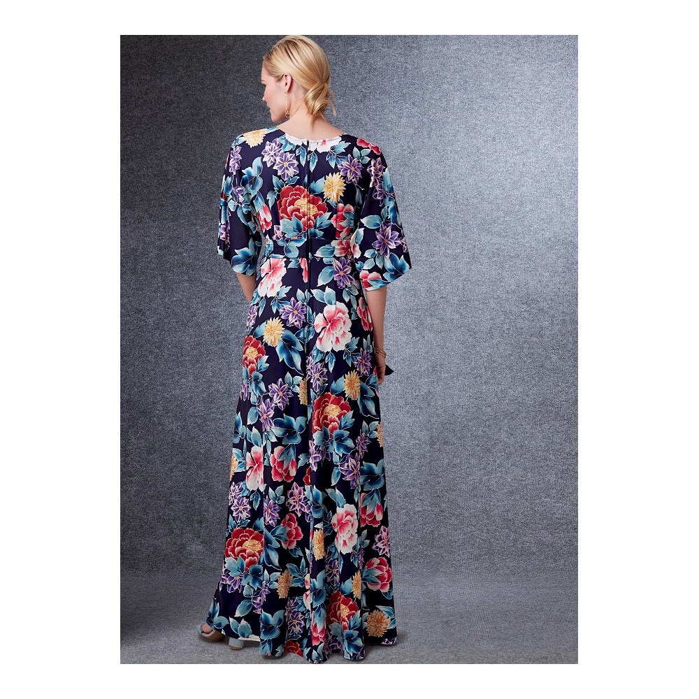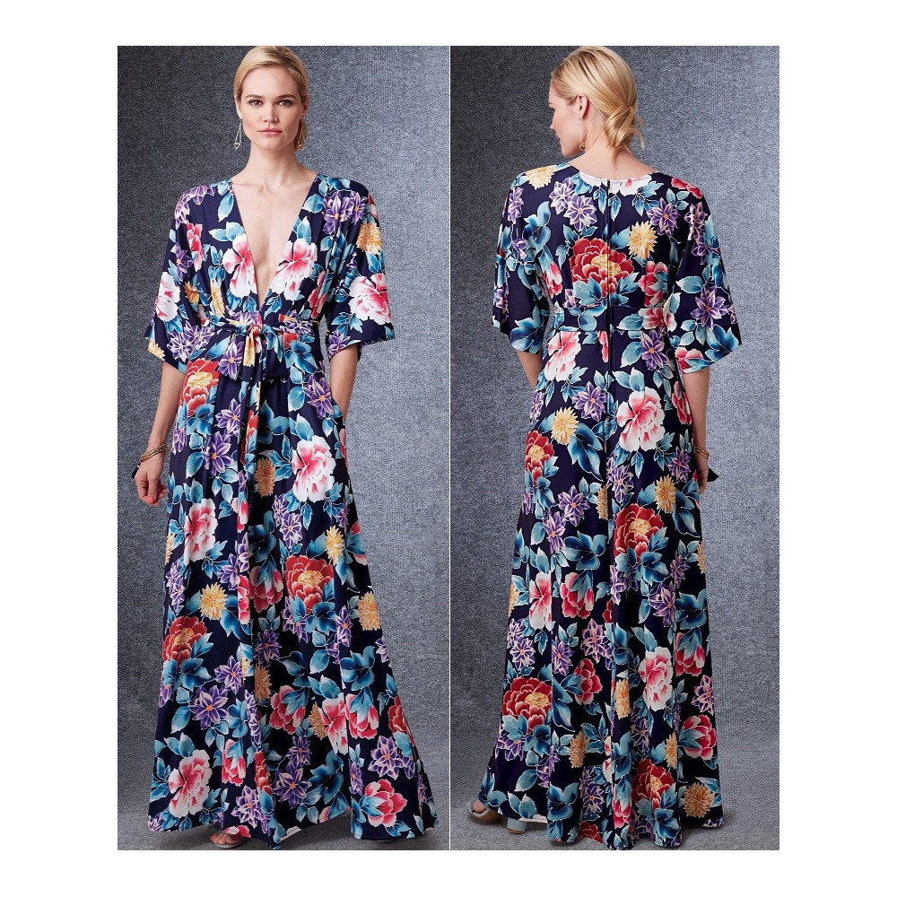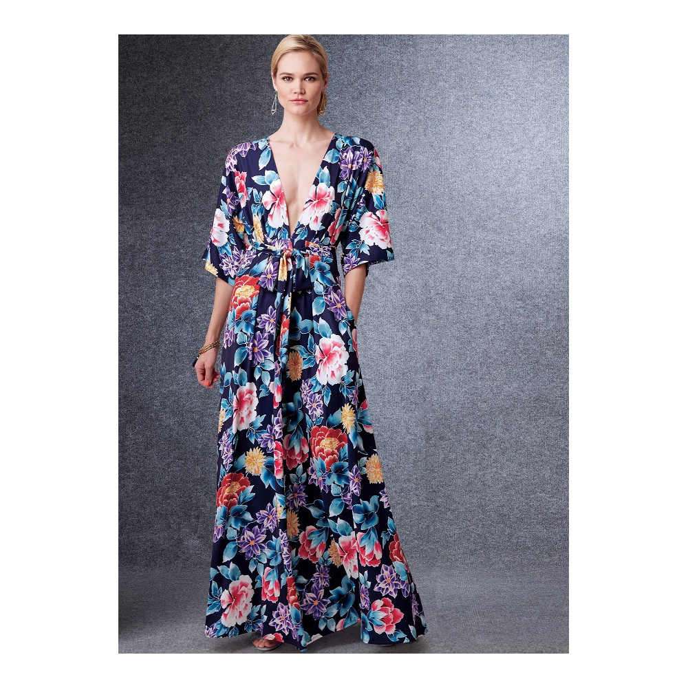 Střih Vogue na dlouhé šaty s hlubokým V-výstřihem a vázáním v pase