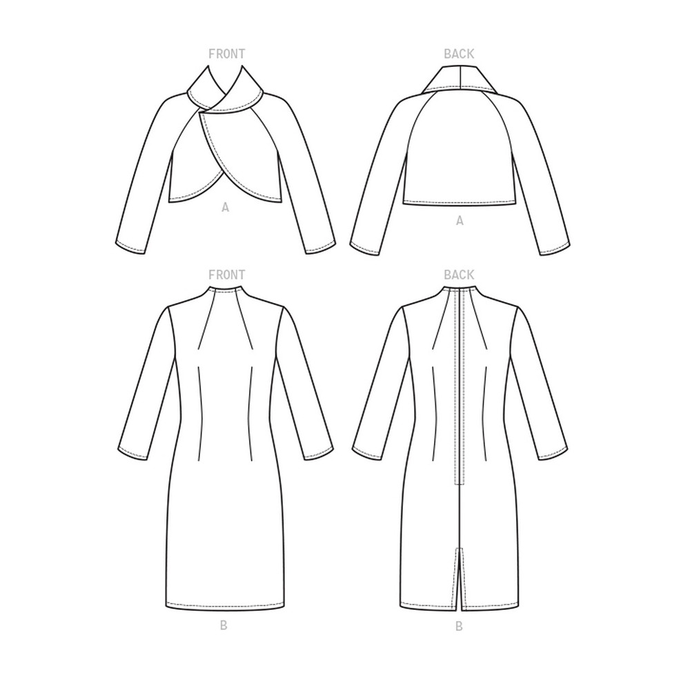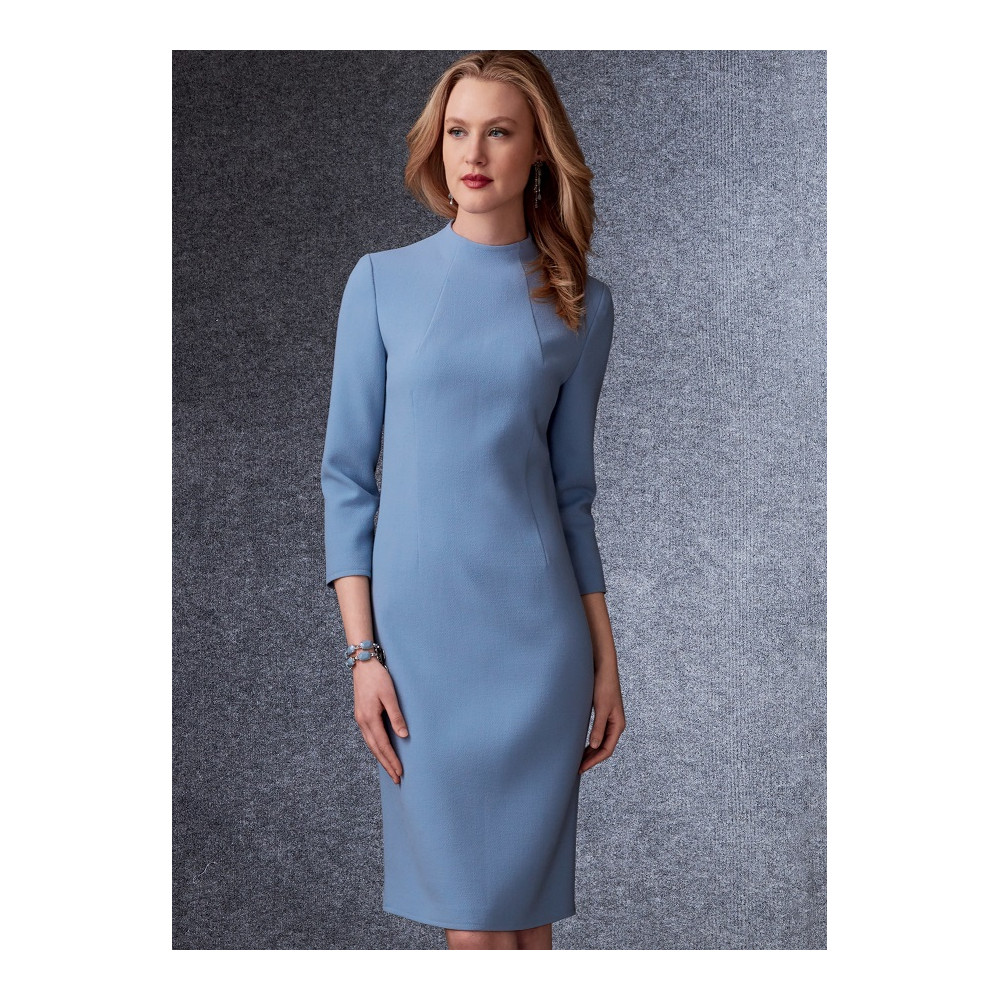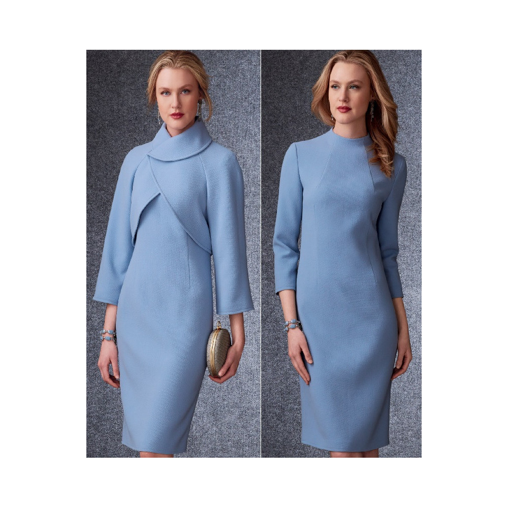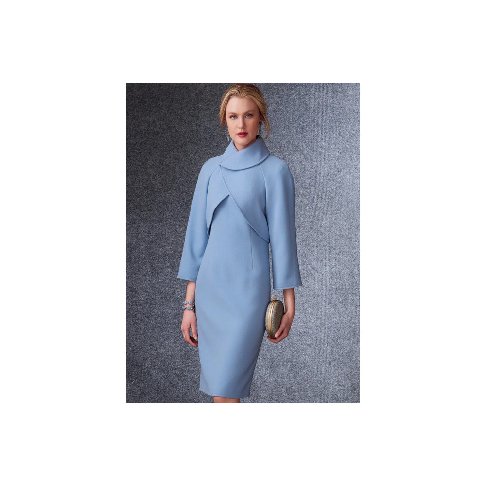 Střih Vogue na úzké šaty ke kolenům se stojáčkem a tvarujícími záševky a krátké sako se širokým límcem a raglánovými rukávy