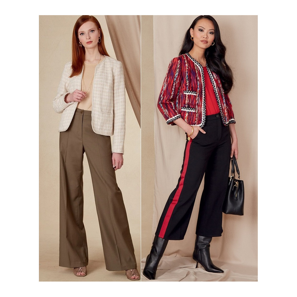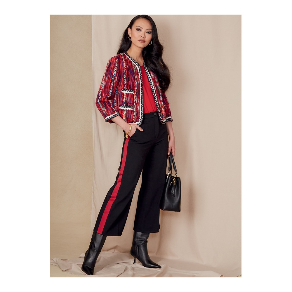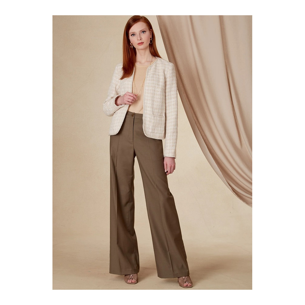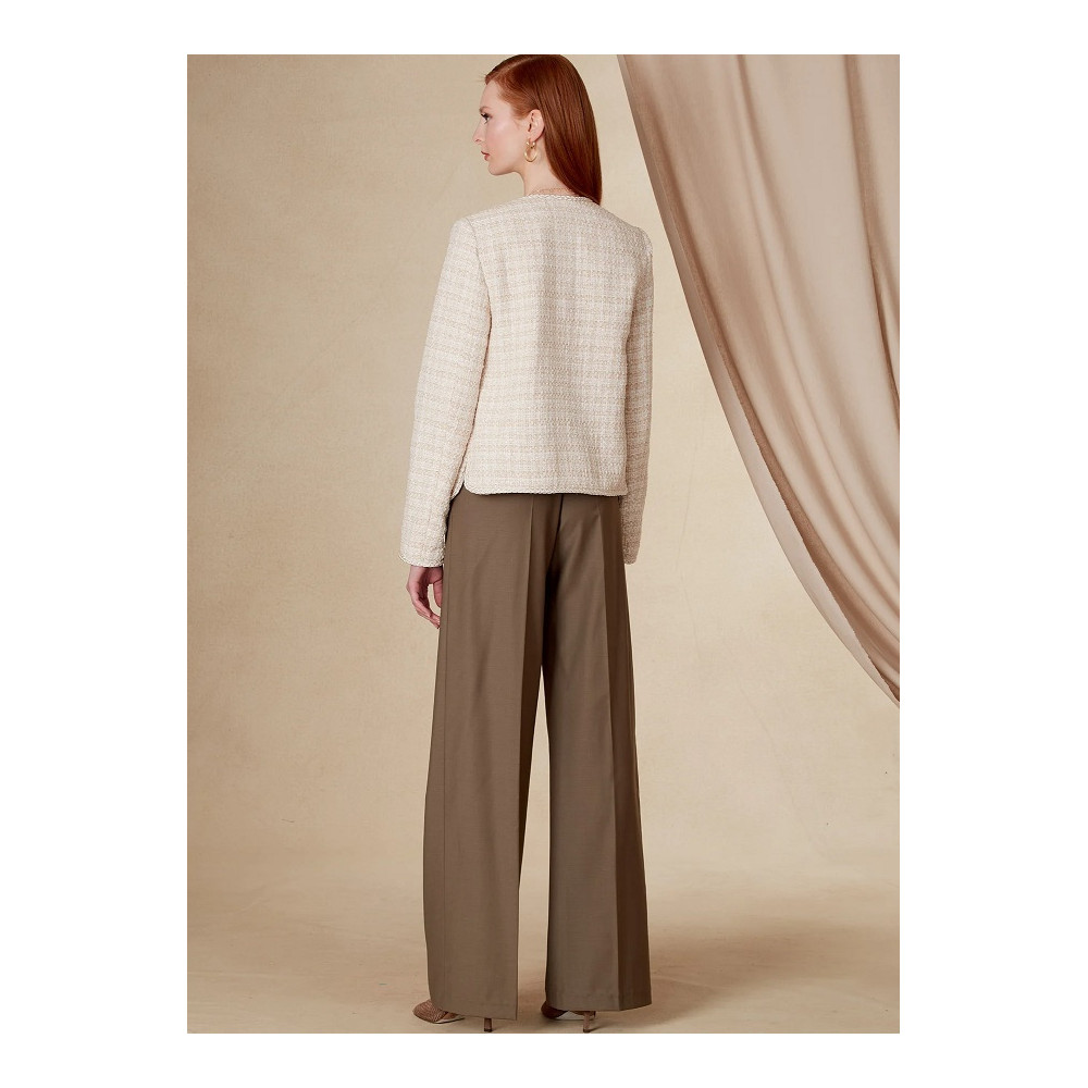 Střih Vogue na krátký otevřený francouzský kabátek (sako) lemovaný ozdobnou bortou a kalhoty se širokými nohavicemi